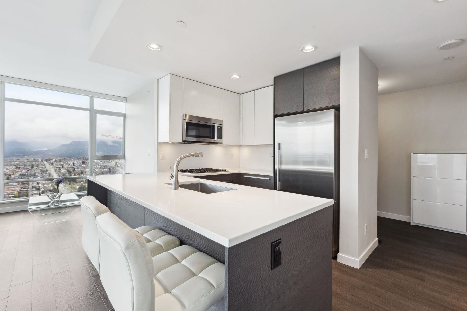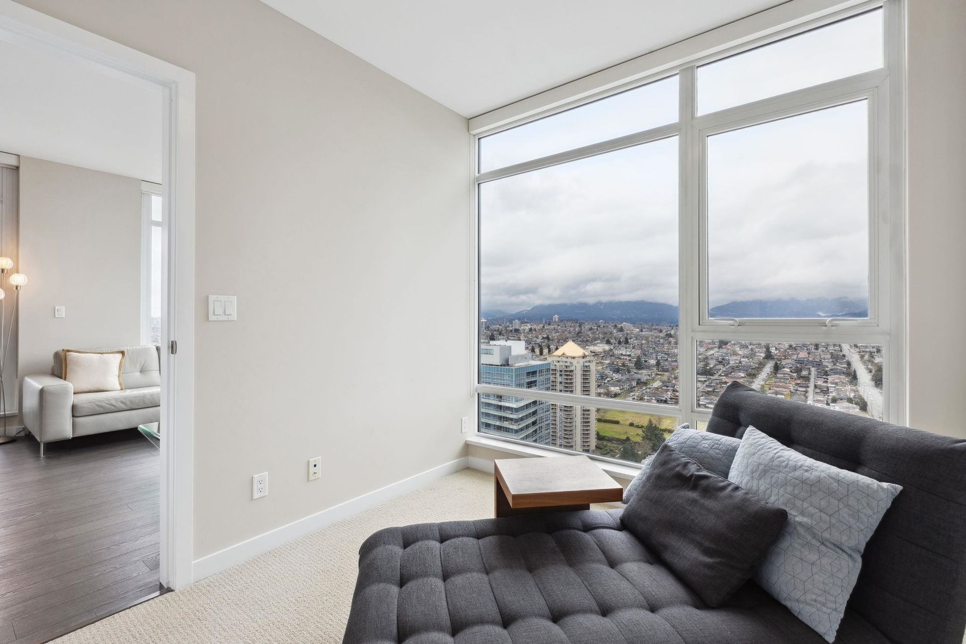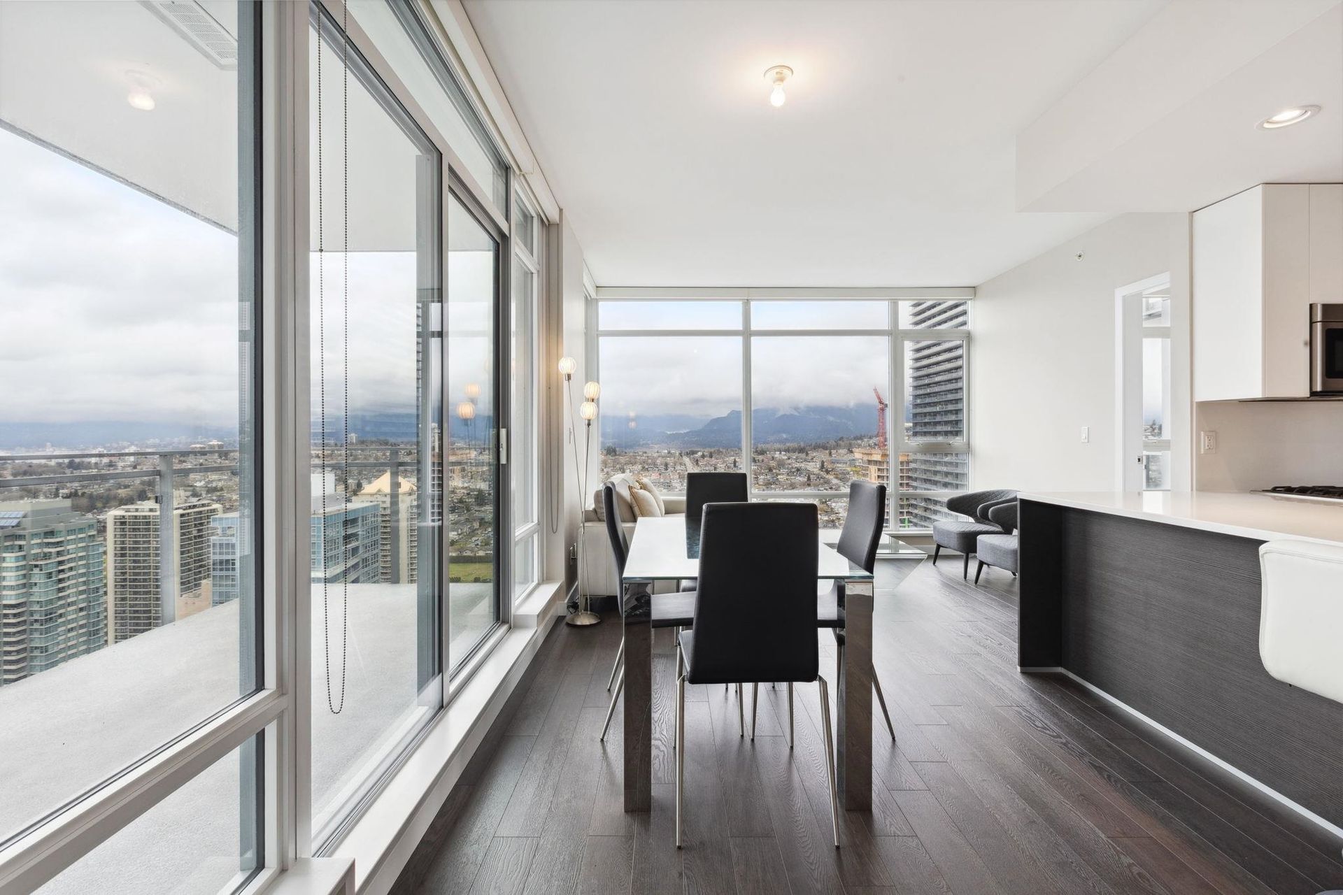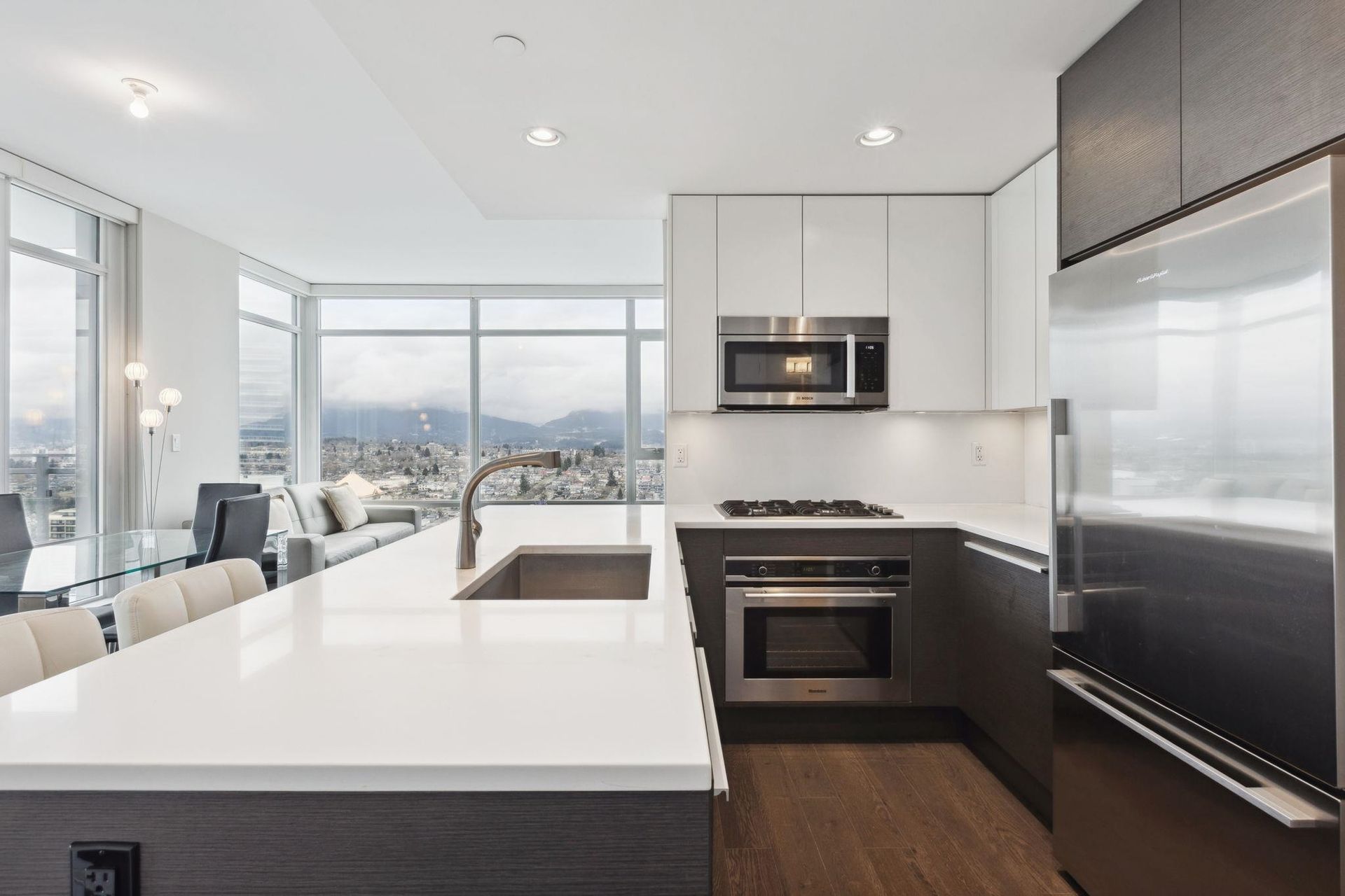 ALTUS AT SOLO DISTRICT. Corner 2 bedroom + den home with stunning city, mountain and water views. Appreciate an open concept floorplan with gourmet kitchen featuring sleek stainless steel appliances, custom cabinetry and quartz counters. This skyhome features geothermal air-conditioning, over-height 8'9 ceilings, and floor to ceiling windows inviting breathtaking views. Separated bedrooms create privacy and the principal suite features a double vanity and oversized walk in shower. An additional den space creates the perfect WFH solution. All of this in the most convenient location - steps to SkyTrain, Whole Foods, BCL, Amazing Brentwood amenities, shopping and eateries! Building amenities include concierge, fitness centre and amazing rooftop decks snd lounges!
