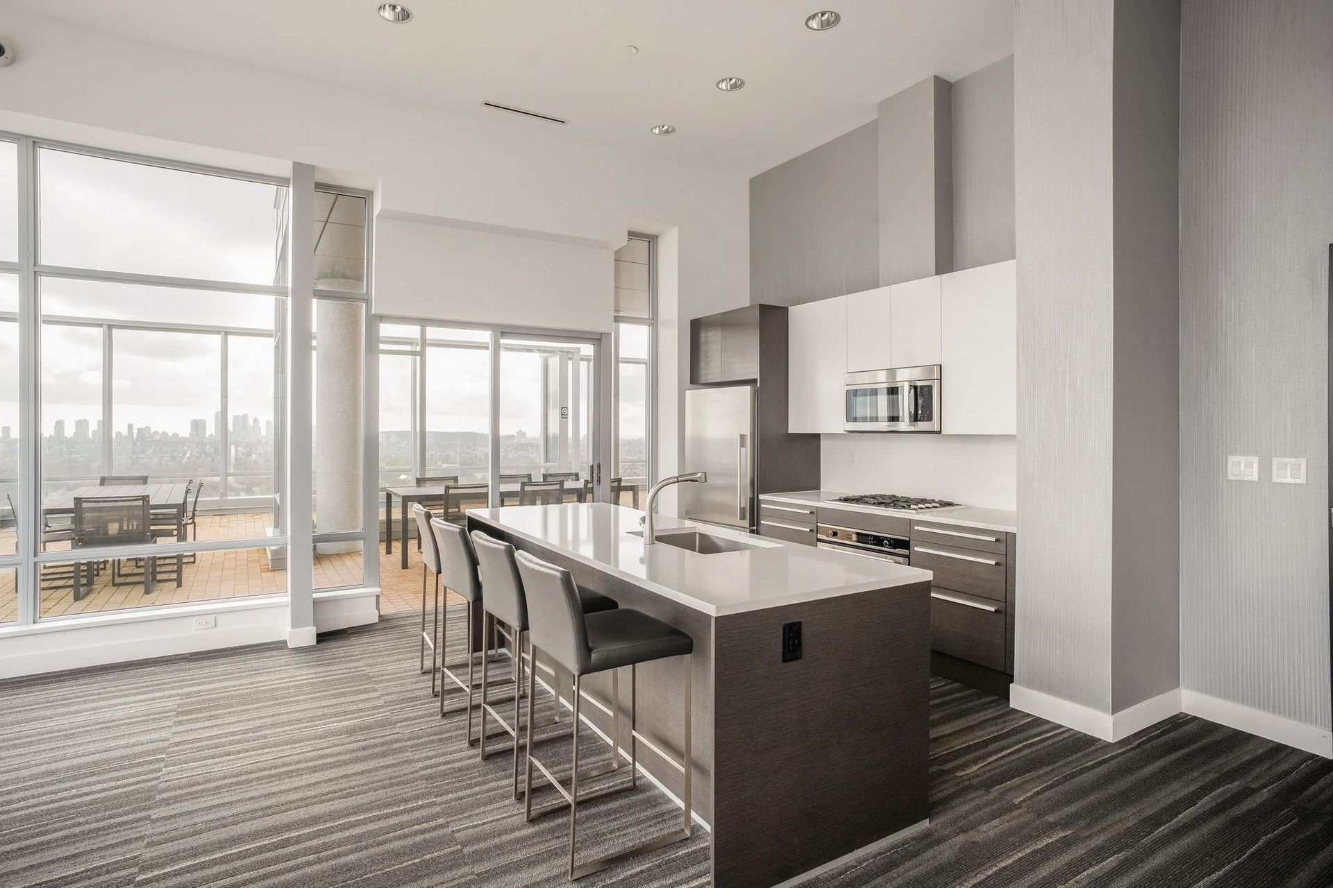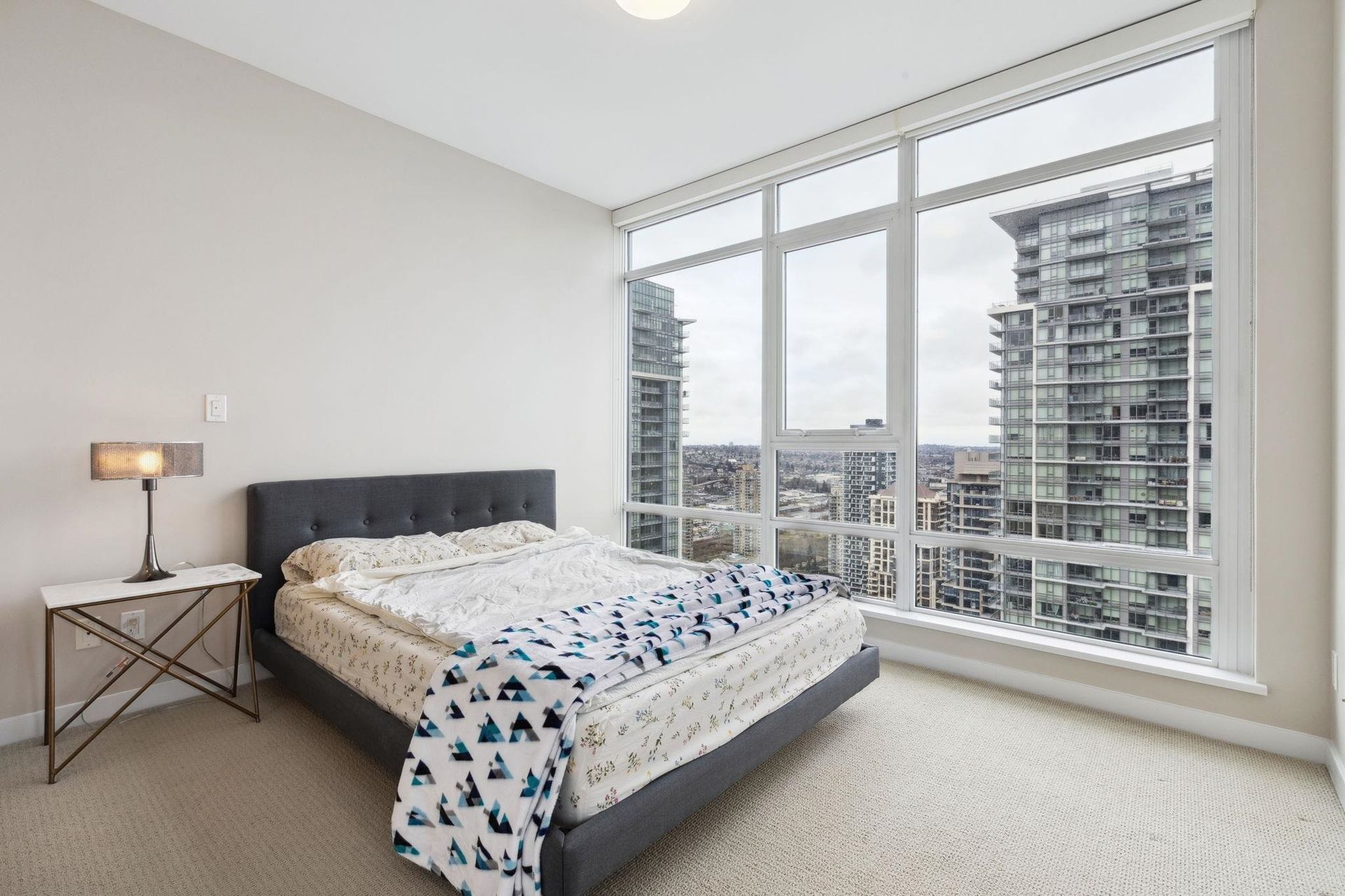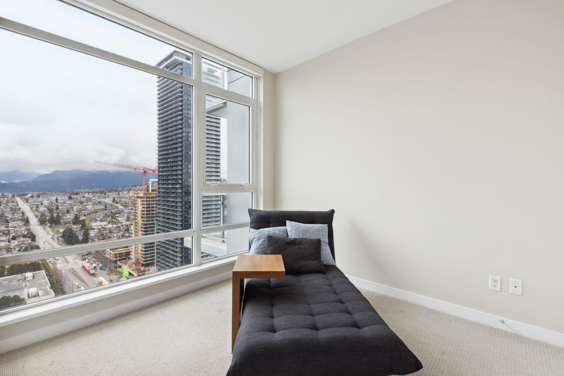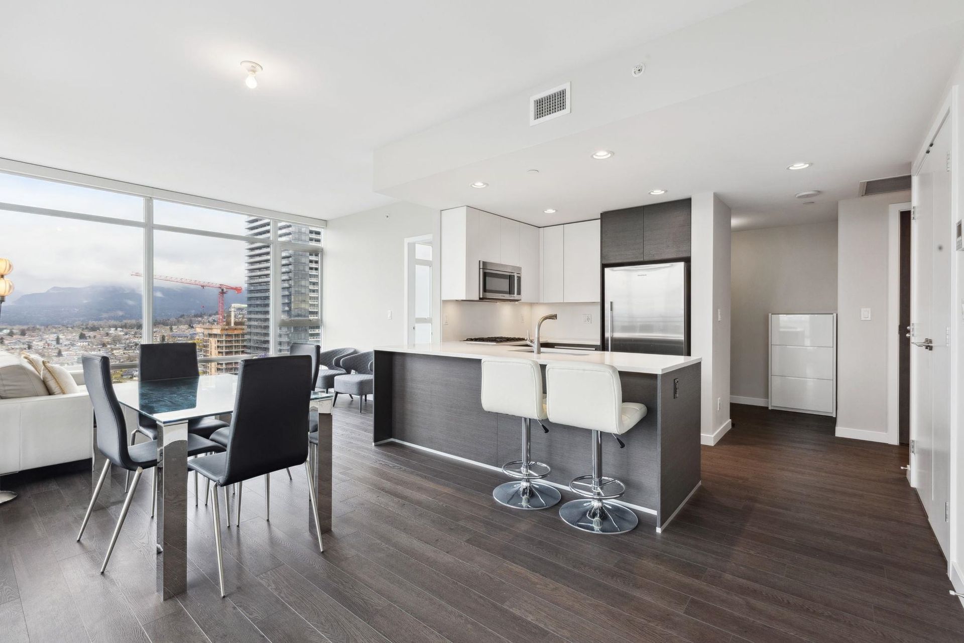 ALTUS AT SOLO DISTRICT. Corner 2 bedroom + den home with stunning city, mountain and water views. Appreciate an open concept floorplan with gourmet kitchen featuring sleek stainless steel appliances, custom cabinetry and quartz counters. This skyhome features geothermal air-conditioning, over-height 8'9 ceilings, and floor to ceiling windows inviting breathtaking views. Separated bedrooms create privacy and the principal suite features a double vanity and oversized walk in shower. An additional den space creates the perfect WFH solution. All of this in the most convenient location - steps to SkyTrain, Whole Foods, BCL, Amazing Brentwood amenities, shopping and eateries! Building amenities include concierge, fitness centre and amazing rooftop decks snd lounges!