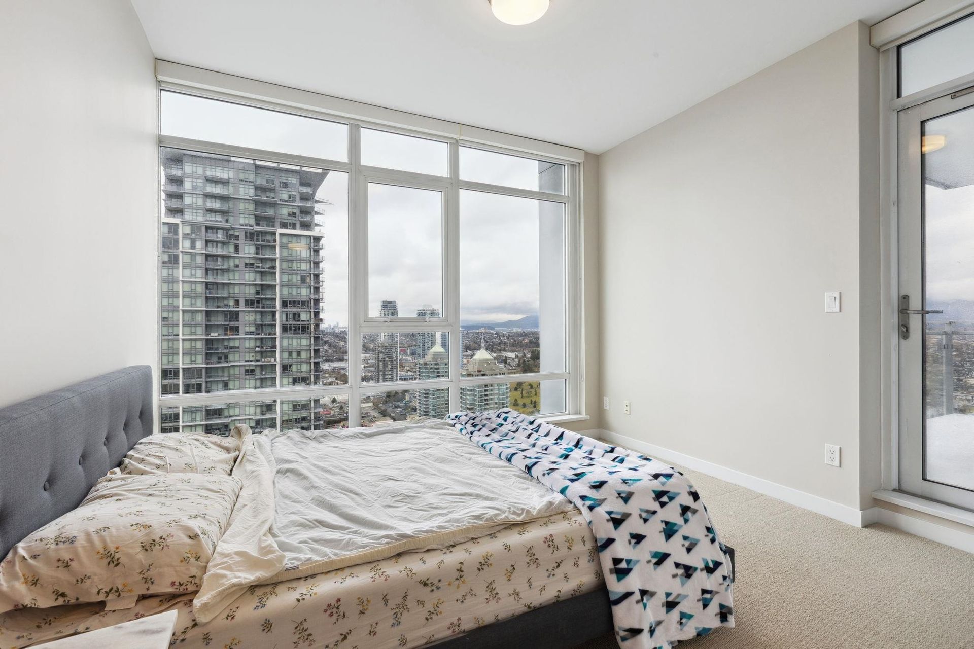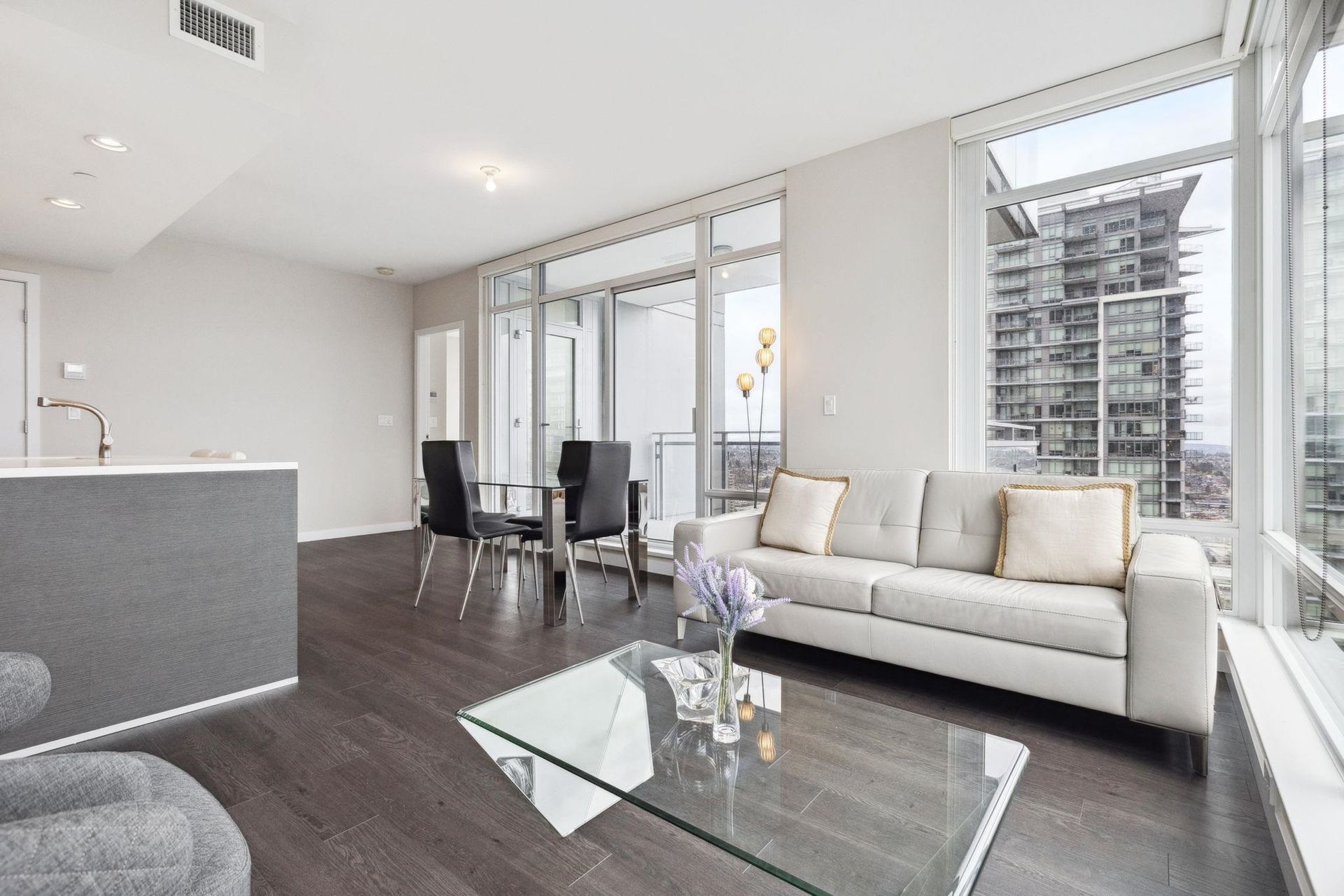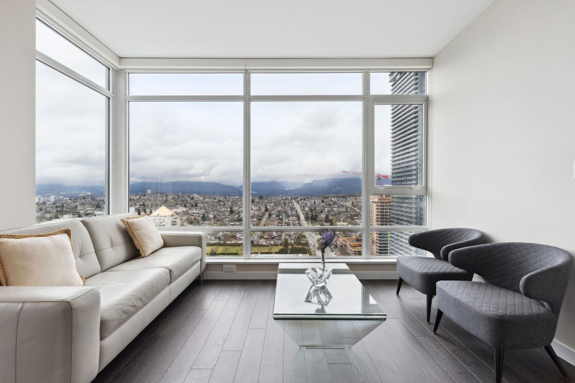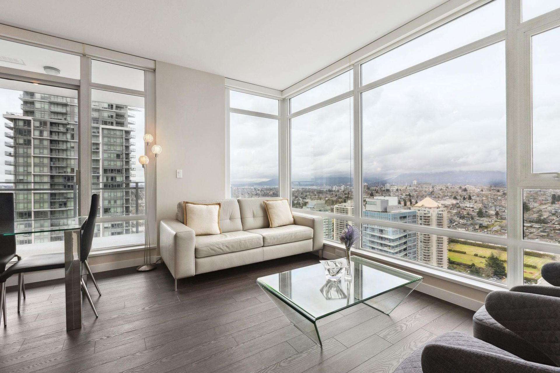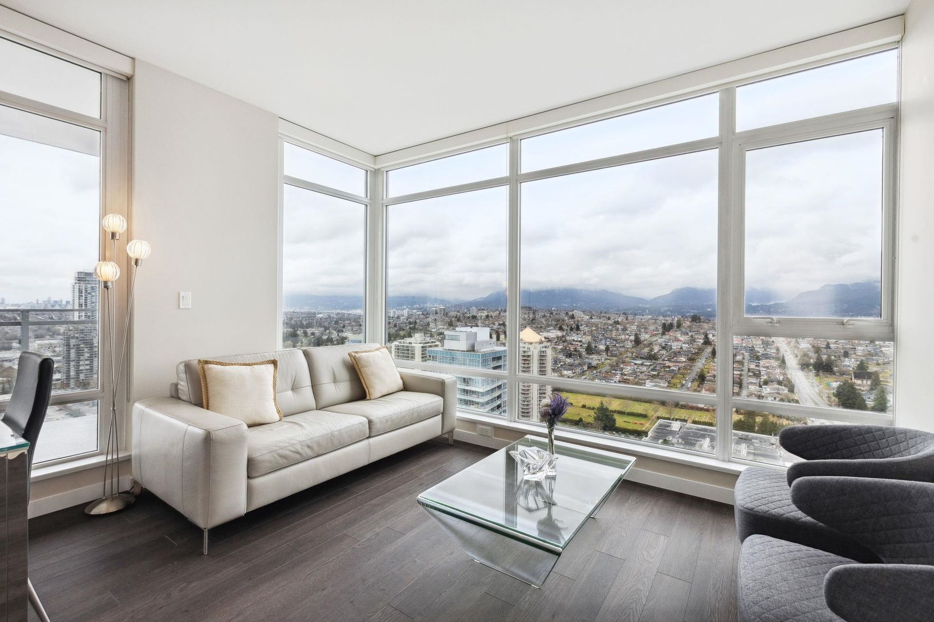 ALTUS AT SOLO DISTRICT. Corner 2 bedroom + den home with stunning city, mountain and water views. Appreciate an open concept floorplan with gourmet kitchen featuring sleek stainless steel appliances, custom cabinetry and quartz counters. This skyhome features geothermal air-conditioning, over-height 8'9 ceilings, and floor to ceiling windows inviting breathtaking views. Separated bedrooms create privacy and the principal suite features a double vanity and oversized walk in shower. An additional den space creates the perfect WFH solution. All of this in the most convenient location - steps to SkyTrain, Whole Foods, BCL, Amazing Brentwood amenities, shopping and eateries! Building amenities include concierge, fitness centre and amazing rooftop decks snd lounges!