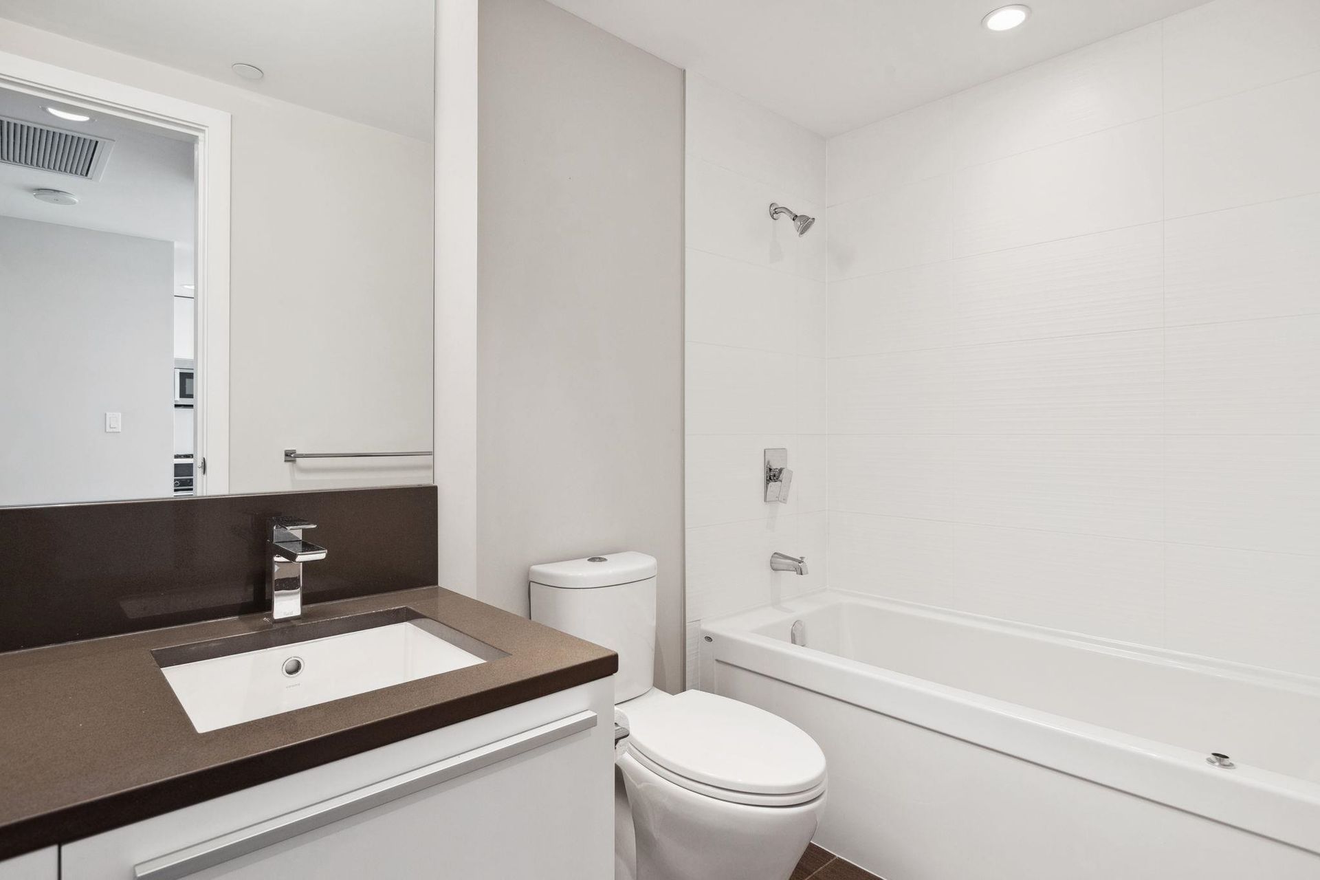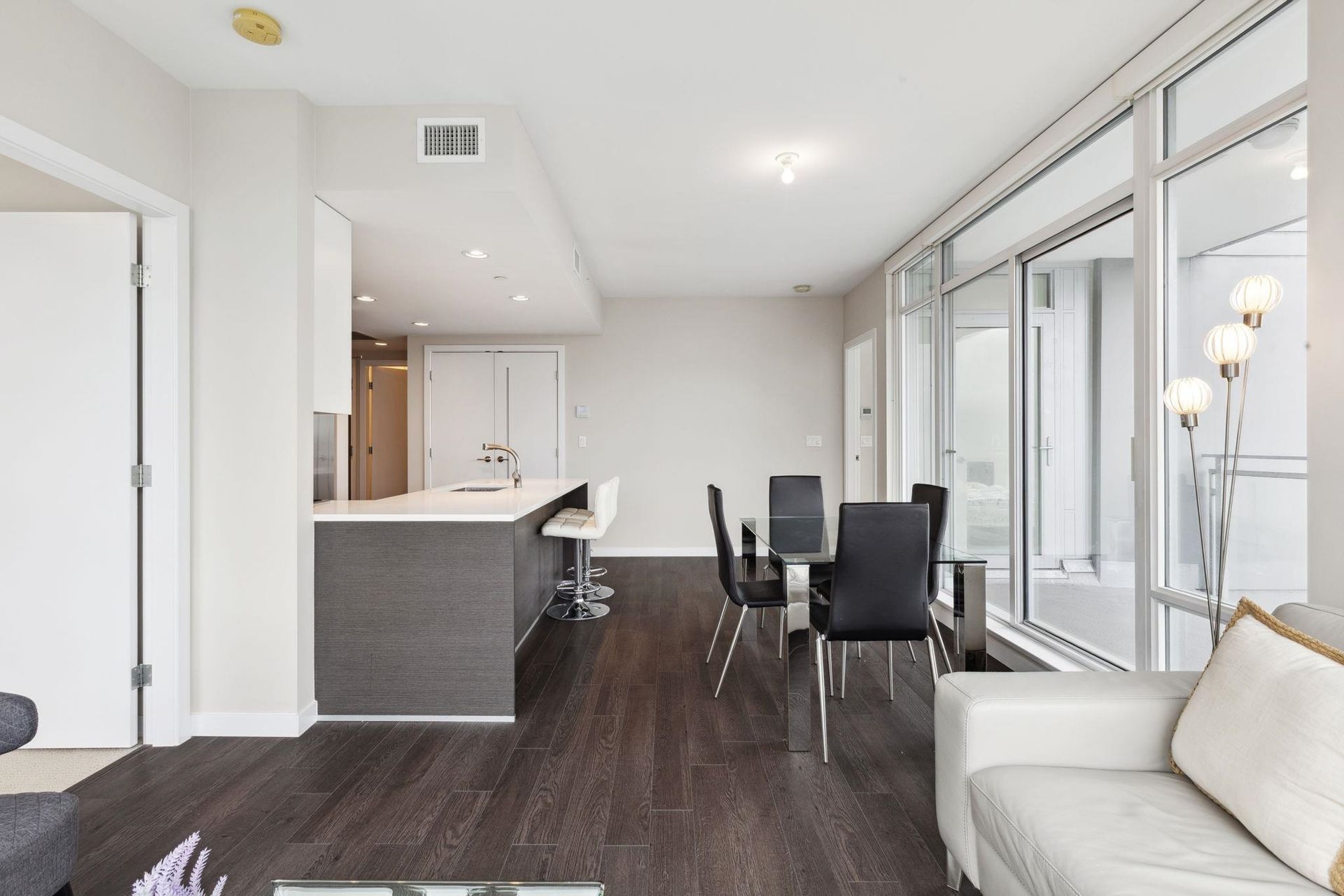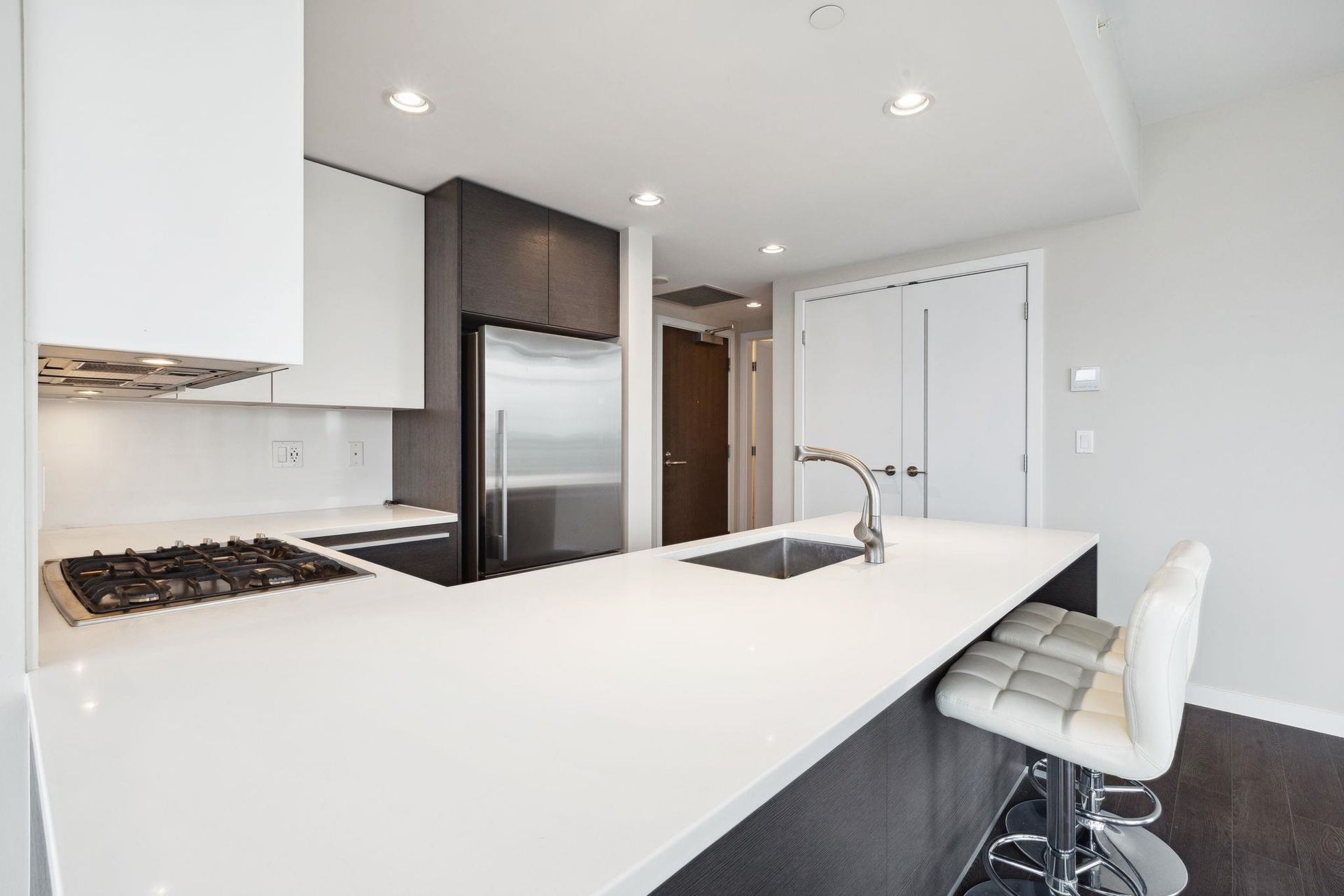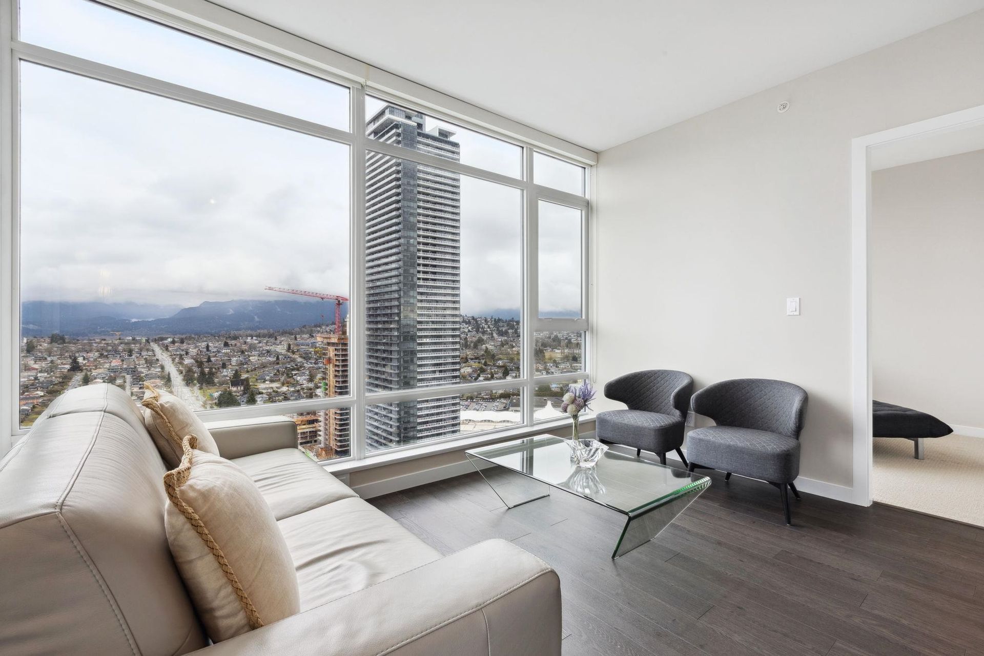 ALTUS AT SOLO DISTRICT. Corner 2 bedroom + den home with stunning city, mountain and water views. Appreciate an open concept floorplan with gourmet kitchen featuring sleek stainless steel appliances, custom cabinetry and quartz counters. This skyhome features geothermal air-conditioning, over-height 8'9 ceilings, and floor to ceiling windows inviting breathtaking views. Separated bedrooms create privacy and the principal suite features a double vanity and oversized walk in shower. An additional den space creates the perfect WFH solution. All of this in the most convenient location - steps to SkyTrain, Whole Foods, BCL, Amazing Brentwood amenities, shopping and eateries! Building amenities include concierge, fitness centre and amazing rooftop decks snd lounges!