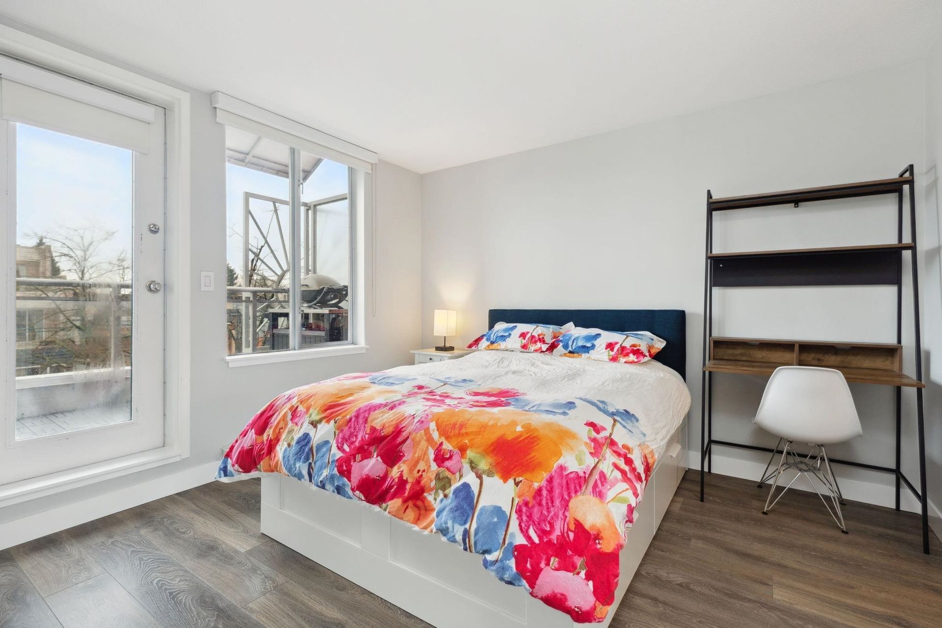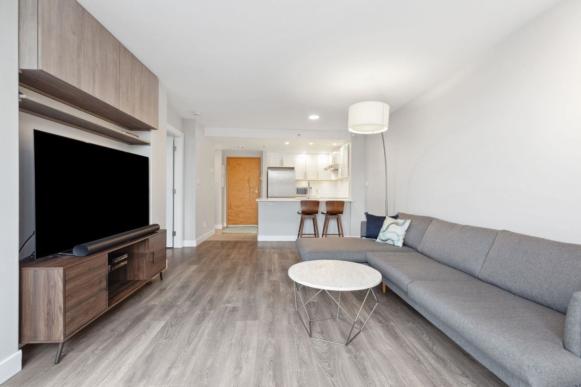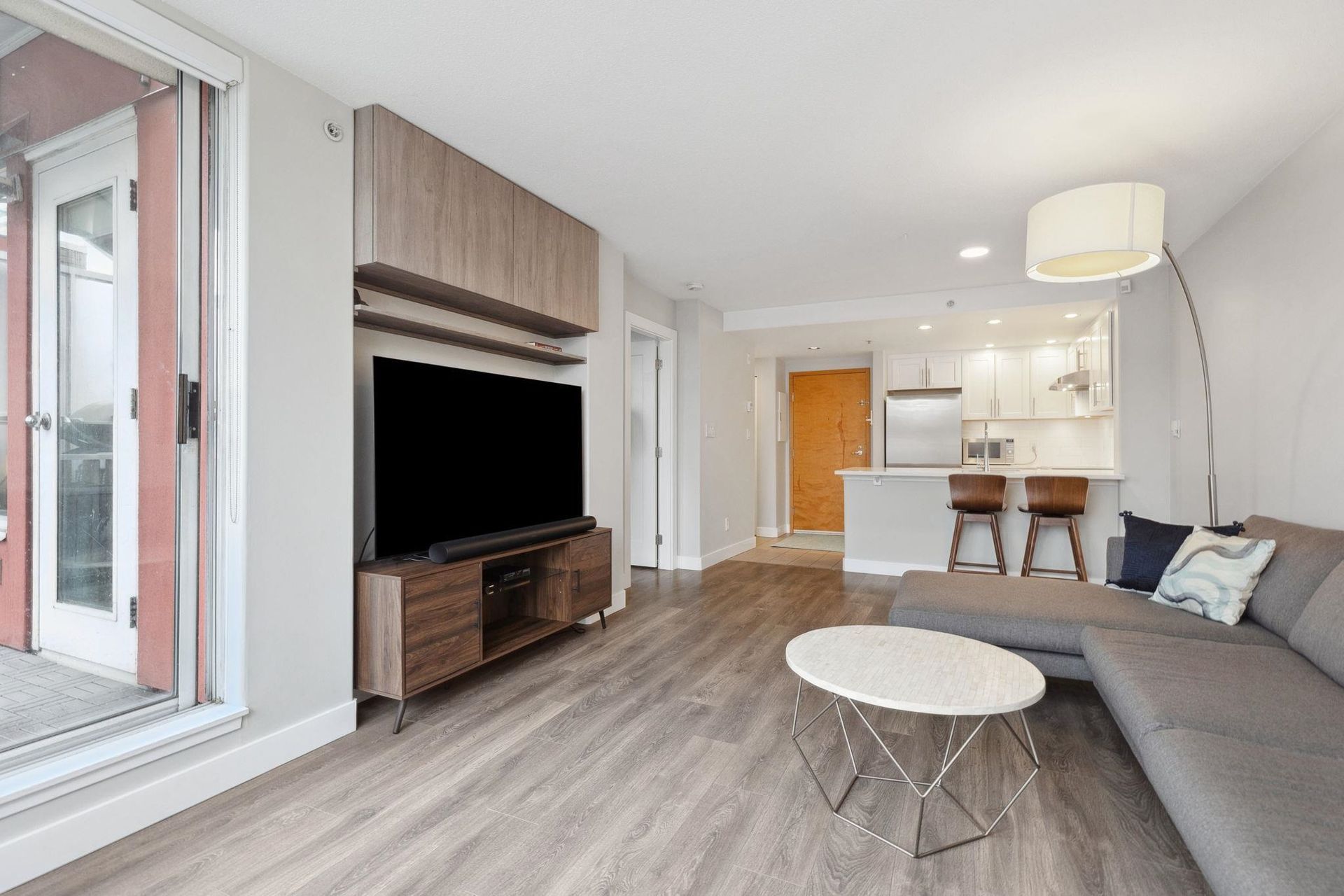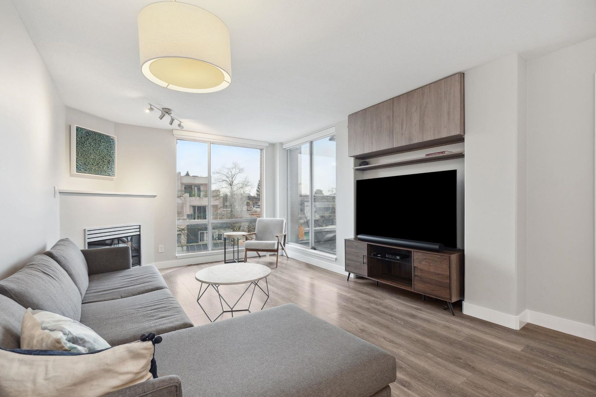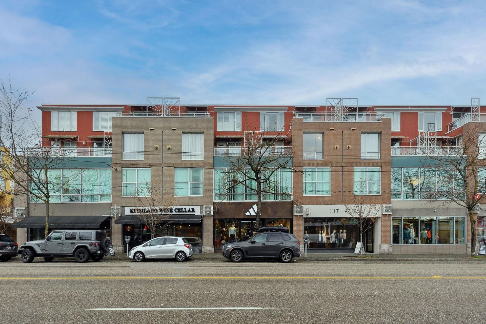 RENOVATED 1 bedroom home at the coveted CONCRETE Capers Building in the heart of Kits! Appreciate a spacious kitchen featuring contemporary cabinetry, sleek stainless appliances, quartz counters and plenty of storage, and flows on durable laminate flooring into the open concept dining and living rooms, punctuated by a gas fireplace and large windows inviting natural light. The bedroom accommodates a king sized bed/WFH setup, his and hers closets and leads to the spa bathroom featuring separate tub/shower and oversized vanity. The patio is sunny, spacious with two access points. All of this in the most convenient location... who wouldn't want to live on top of Whole Foods and steps from Shoppers, Kits Beach, West 4th shopping and eateries! 1 parking & 1 XL storage. OPEN HOUSE: MAR 8/9 2-4PM