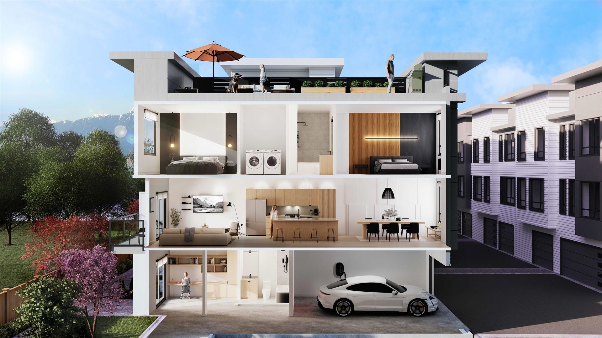 VIVID TOWNHOMES by AULUME PROPERTIES! A boutique collection of 15 3&4 bedroom contemporary townhomes with rooftop decks! This 4 bedroom townhome features an open concept kitchen with shaker cabinetry, large kitchen island with quart waterfall countertops, stainless steel appliances including gas range, flowing on durable laminate flooring into the spacious living and dining rooms. Appreciate 9' ceilings, forced air heating and air-conditioning throughout. Above is a primary suite with double vanity and 2 additional spacious bedrooms and a shared bathroom with double vanity. Below is an ensuite fourth bedroom. This home features a 663SF rooftop deck with gas hookup! Est. Completion April/May. Purchase with only 10% deposit. All of this in a super convenient and quickly growing neighbourhood