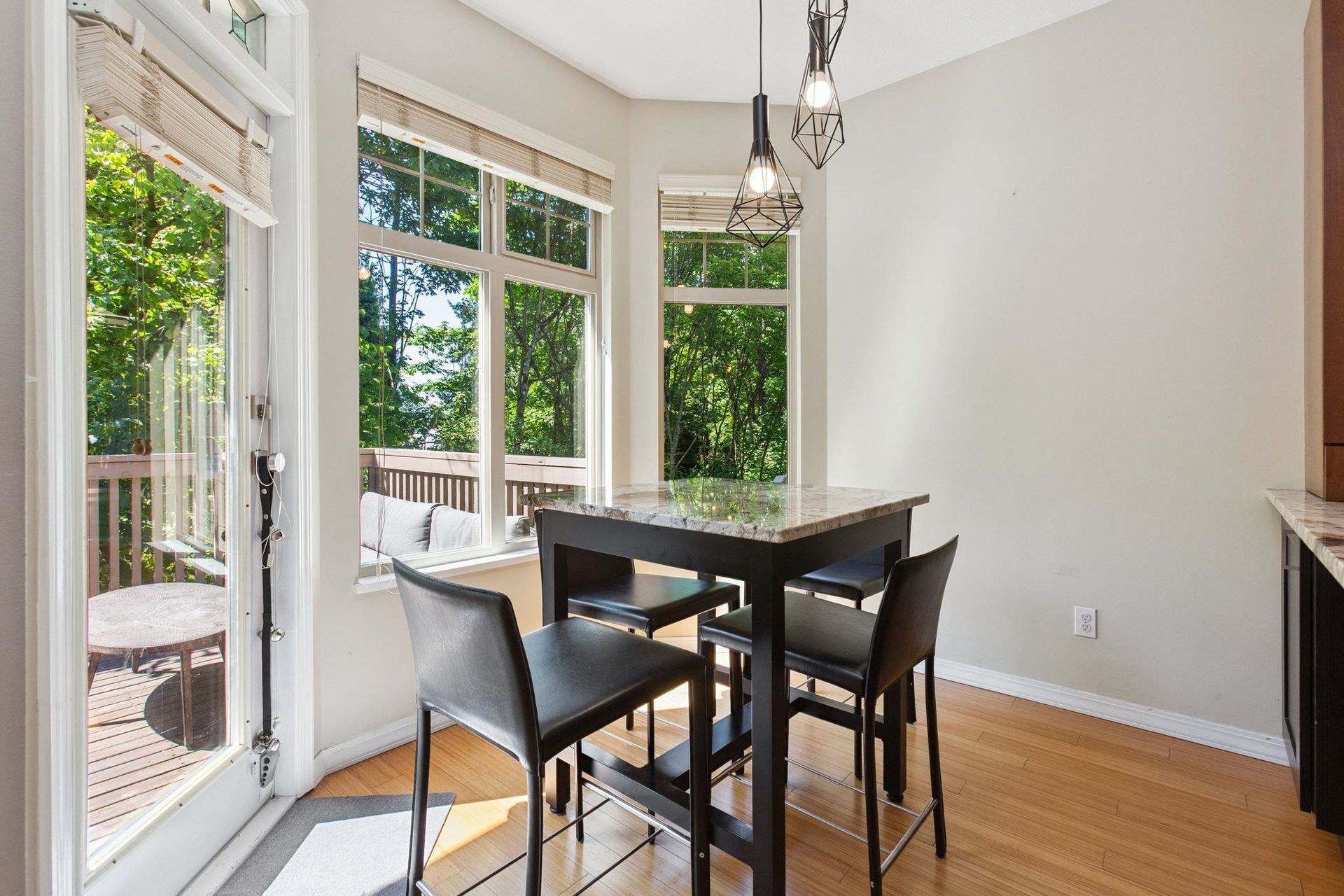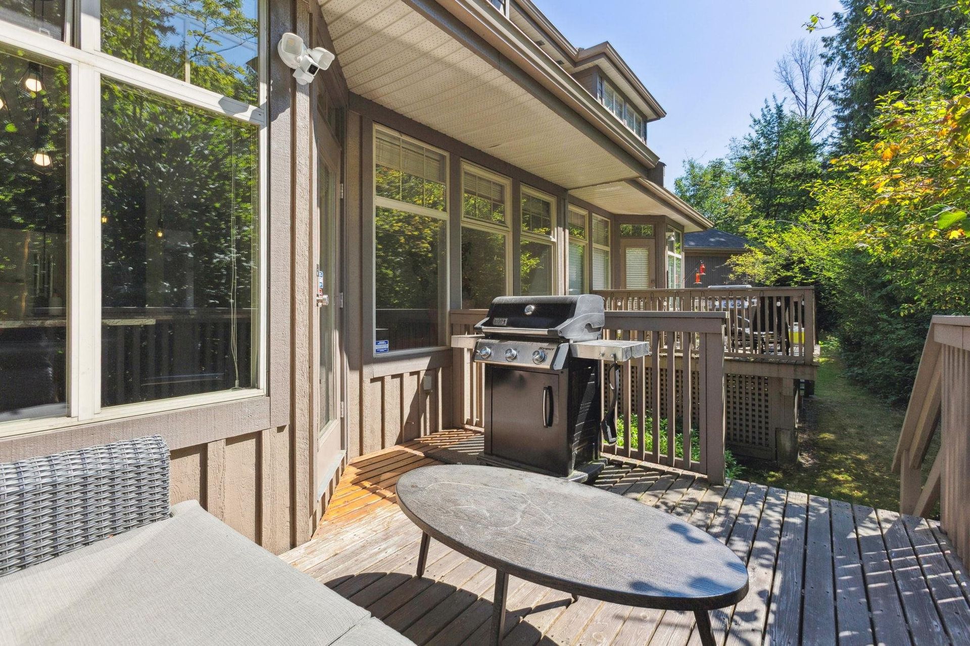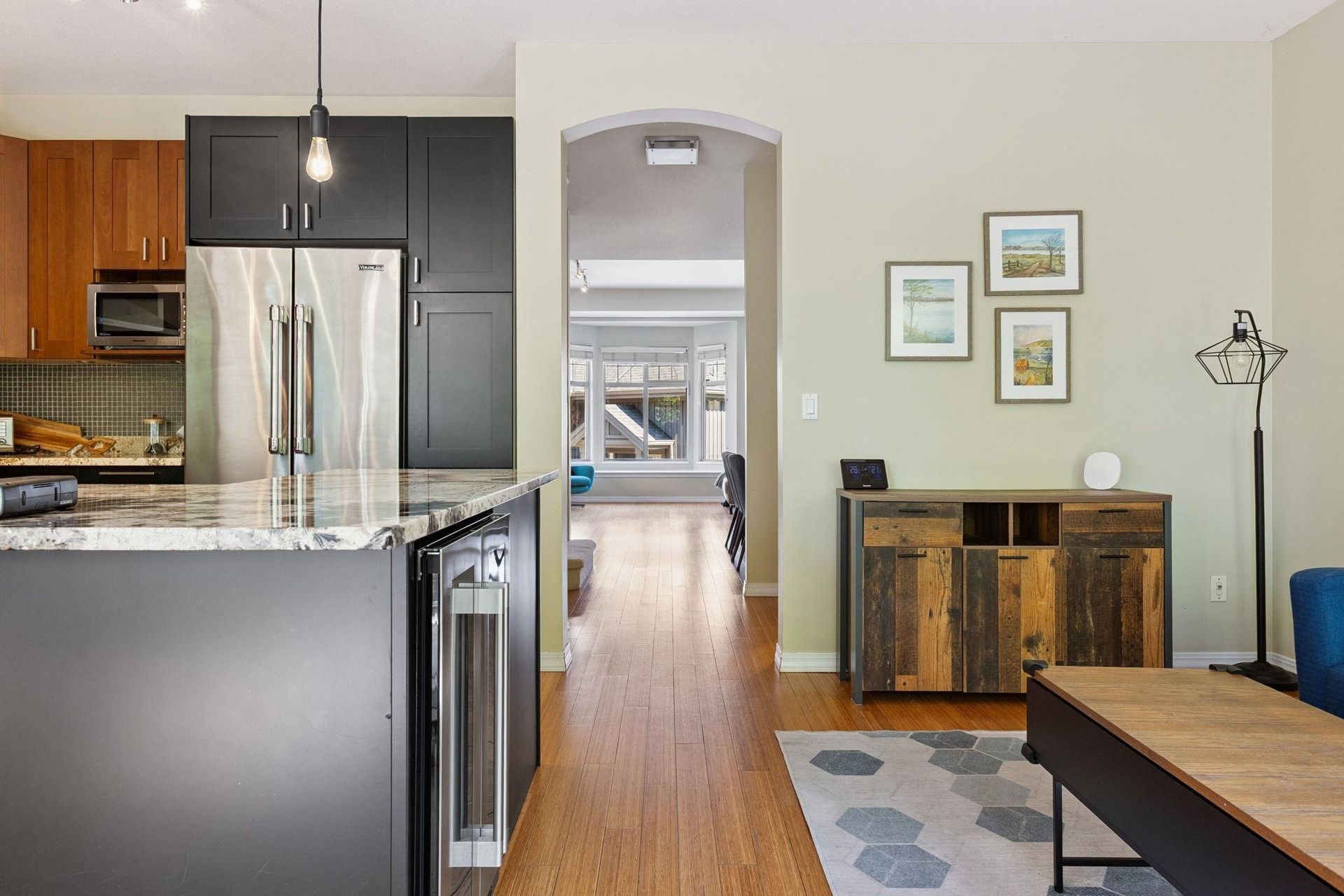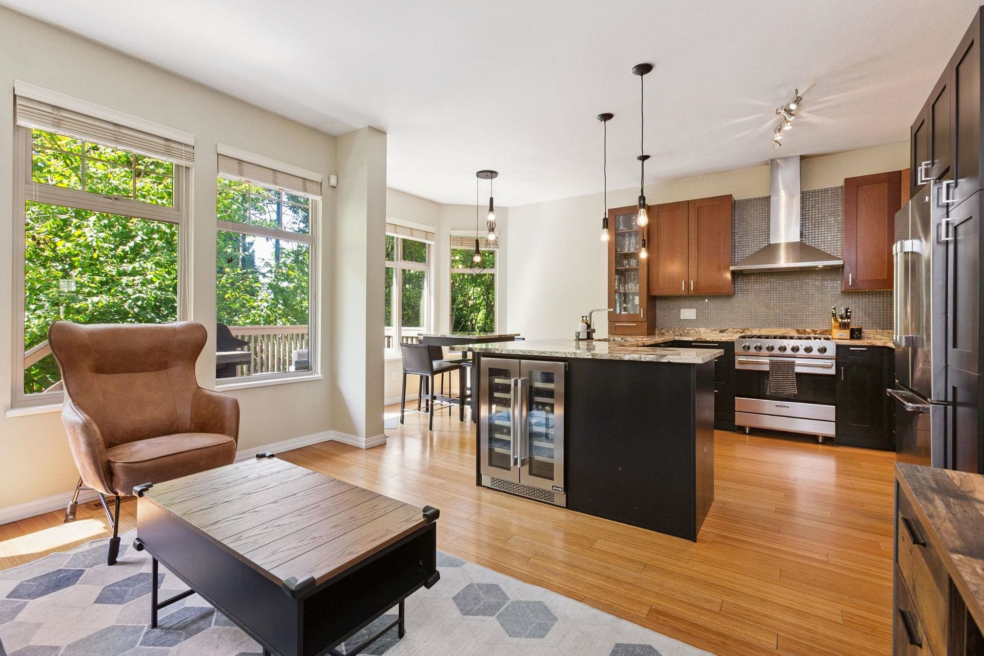RENOVATED DUPLEX STYLE TOWNHOUSE WITH AIR-CONDITIONING in desirable CRESCENT HEIGHTS complex. 2,123SF of well appointed, functional living space over 3 spacious levels. The gourmet kitchen features top of the line Viking appliances, granite counters and custom cabinetry, flowing on durable hardwood flooring into the family room, dining room and living room with cozy gas fireplace, bay window seating and overheight 9' ceilings. Off the kitchen is a sunny deck with additional grass for pets! Upstairs are 3 spacious bedrooms including oversized primary with walk in closet and 5 piece ensuite. Below is a fourth bedroom and bathroom - perfect for in-laws or nanny quarters. Appreciate lush treeline views, Hunter Douglas blinds, designer lighting and side-by-side garage!