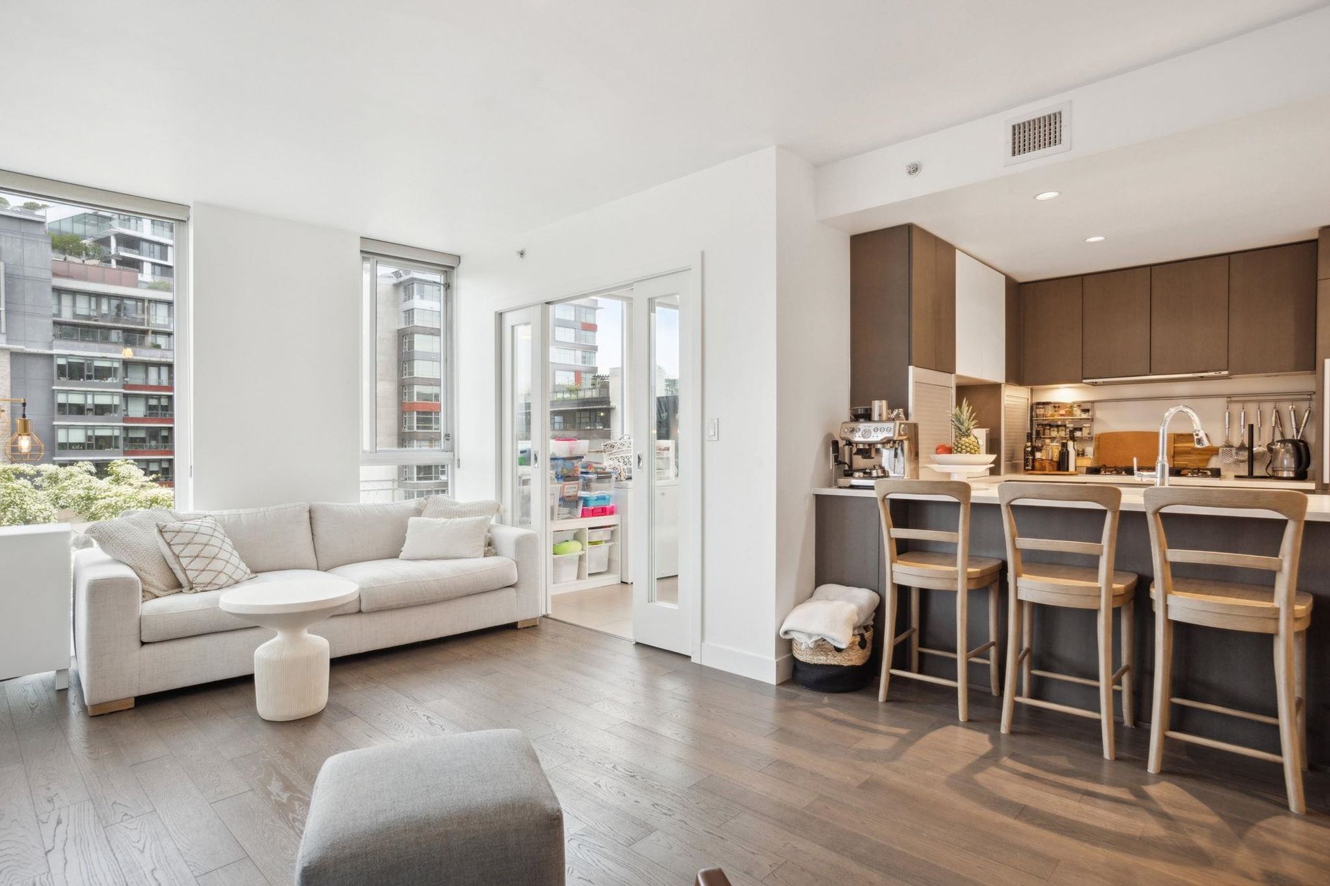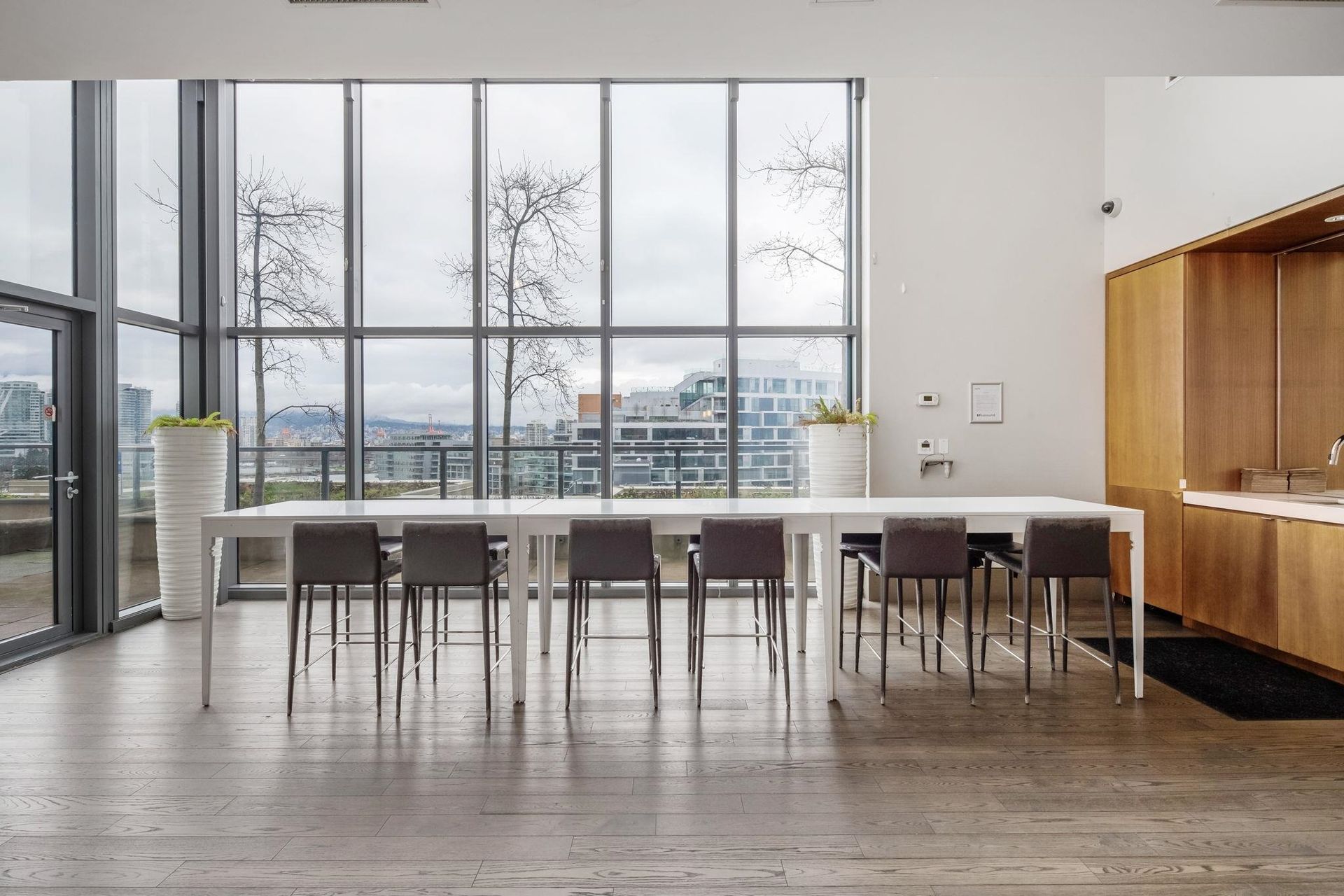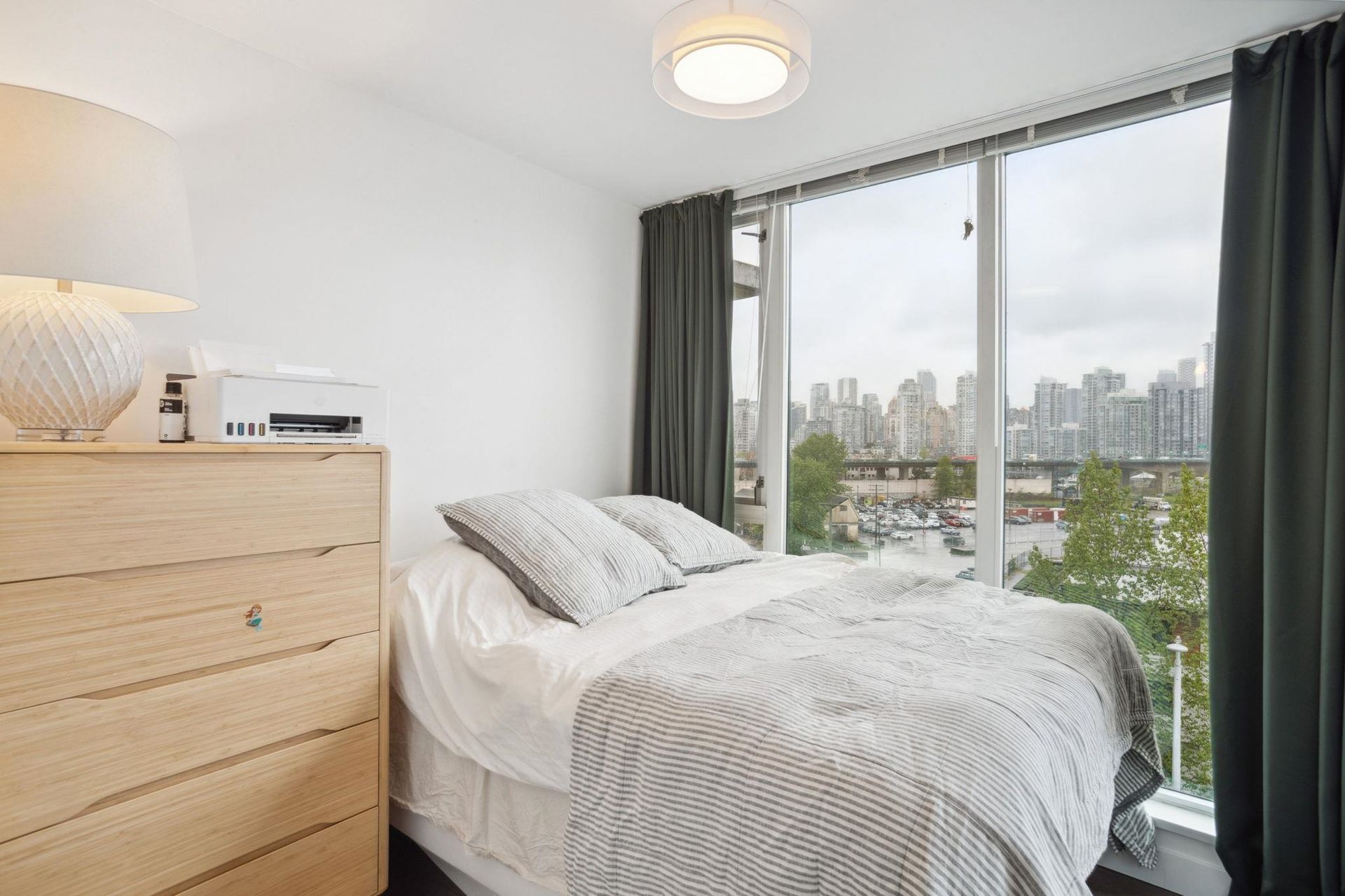 JAMES by CRESSEY. Gorgeous NE corner 2 bedroom, 2 bath home with solarium AND den with city, False Creek & mountain views! This home features a sleek kitchen with integrated appliances, quartz counters and plenty of storage. Separated bedrooms create ultimate privacy and an enclosed balcony serves as the perfect WFH setup. The bathrooms feature contemporary tiling and spa-like finishes. Appreciate air-conditioning and floor to ceiling windows inviting beautiful, yet peaceful views. All of this in the heart of False Creek/Olympic Village - steps to the Seawall, eateries, breweries, parks and transit (SkyTrain & bus). Includes 1 parking & 1 storage. Building amenities include: rooftop lounge, fitness centre, concierge & sauna.