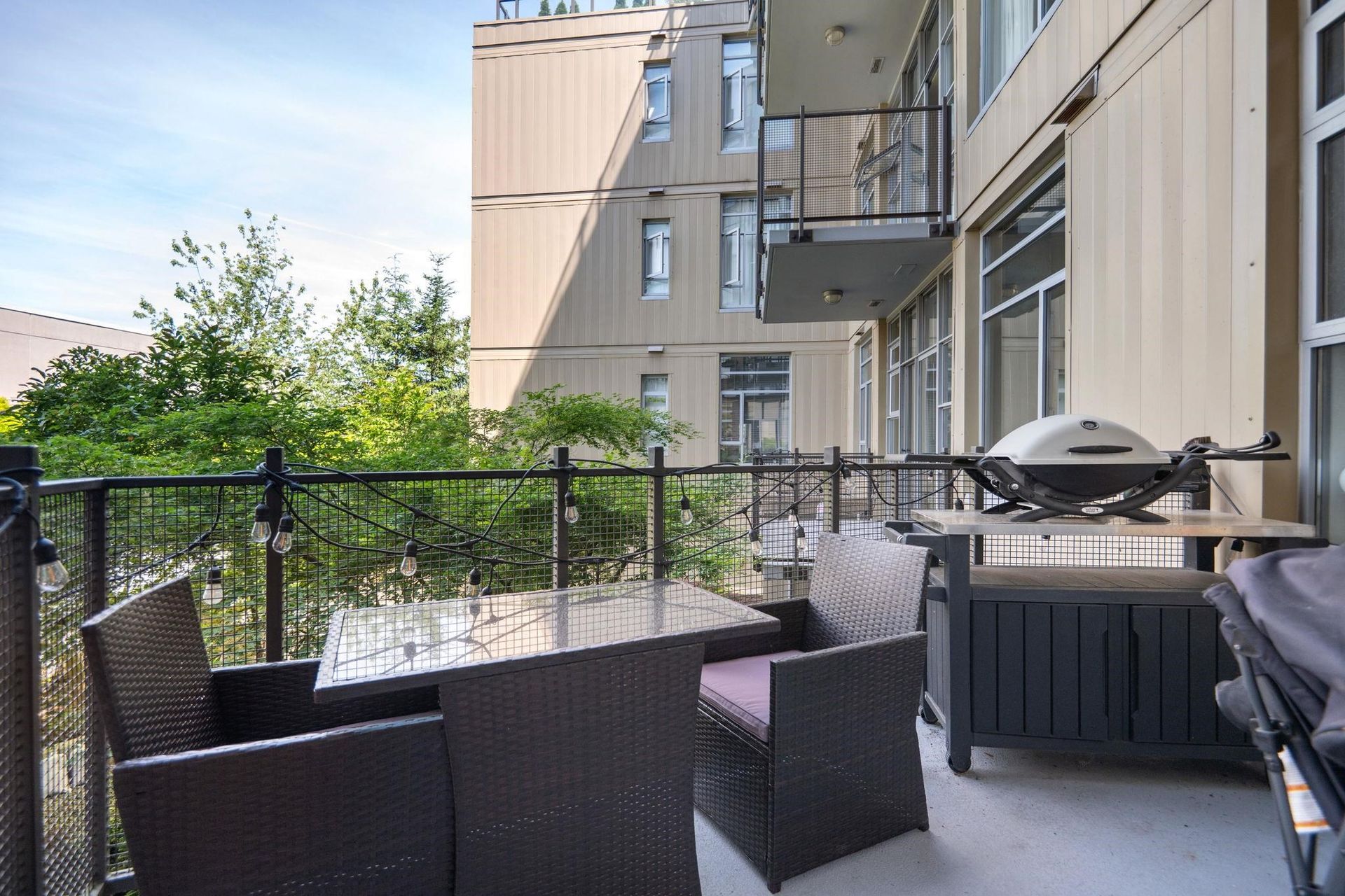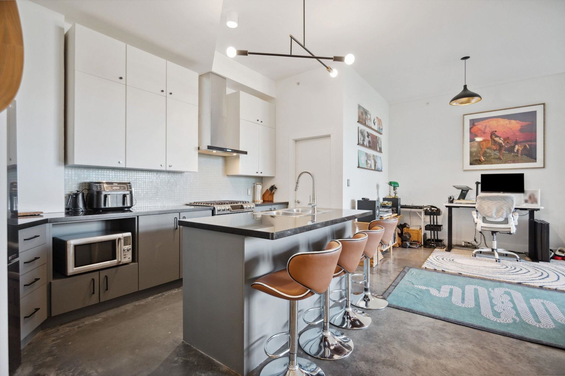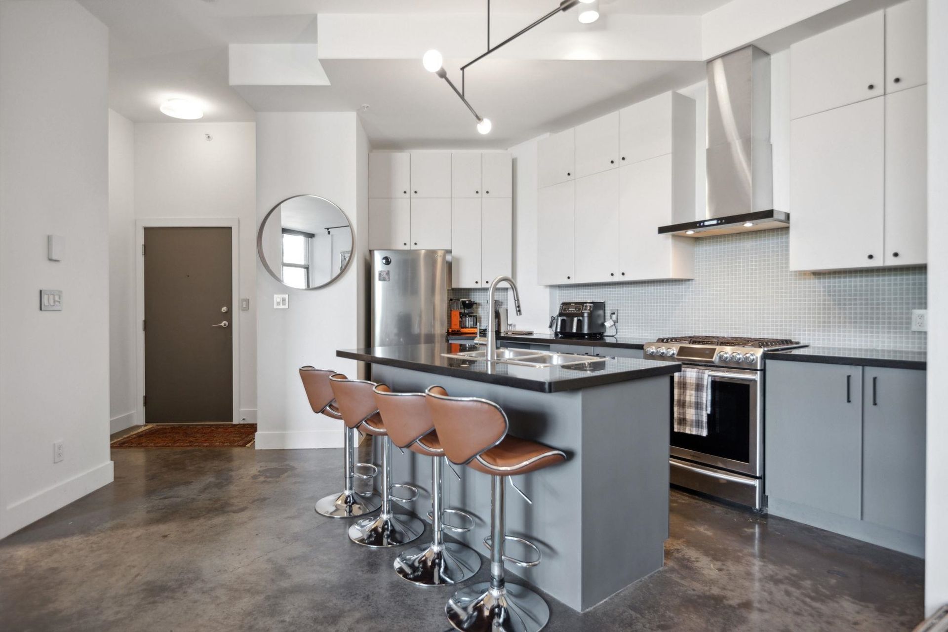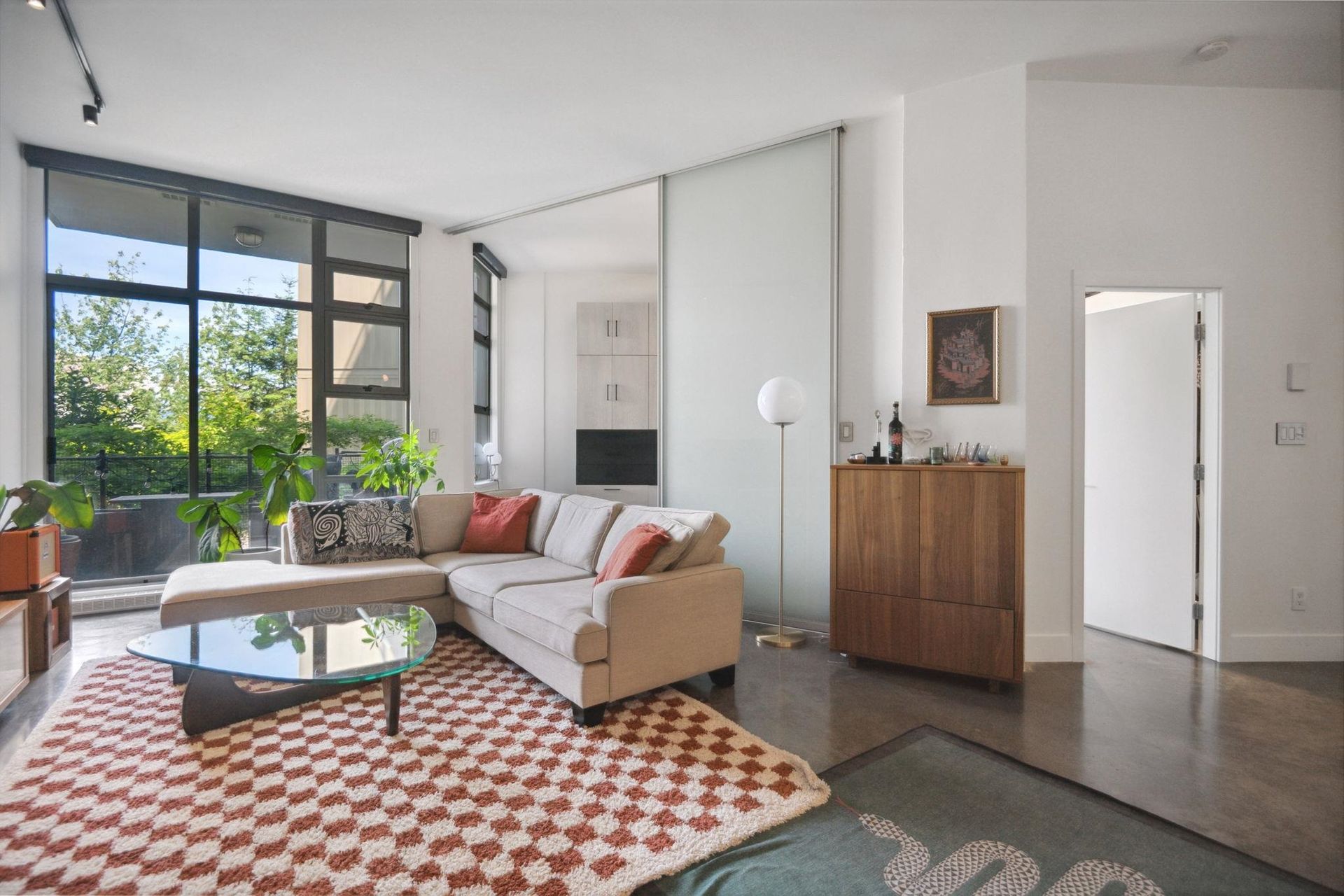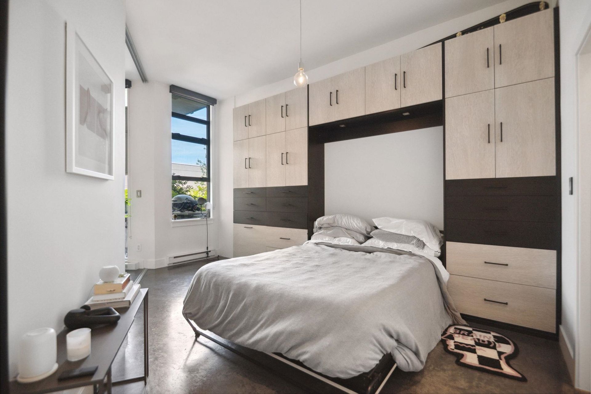 SLEEK 1 BEDROOM LOFT LIVING (CAN BE MADE INTO A 2 BEDROOM) IN MOUNT PLEASANT'S MOST DESIRABLE BUILDING! Welcome to the epitome of industrial loft living with polished concrete floors, and soaring ceilings. The kitchen features floor to ceiling cabinetry, updated stainless appliances, and a kitchen island with black granite counters, flowing into the separated living and dining spaces, framed and punctuated by floor to ceilings windows inviting quaint courtyard views. Appreciate the spacious covered patio, flat ceilings, roller blinds, updated lighting, and updated bathroom. The bedroom is roomy and inviting and features a fully integrated California Closet closet/storage system. Steps to the city's best restaurants, shopping and transit.