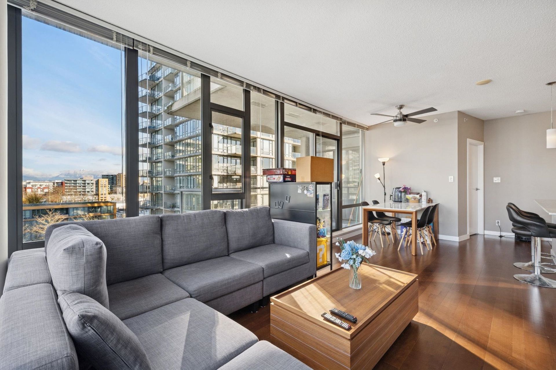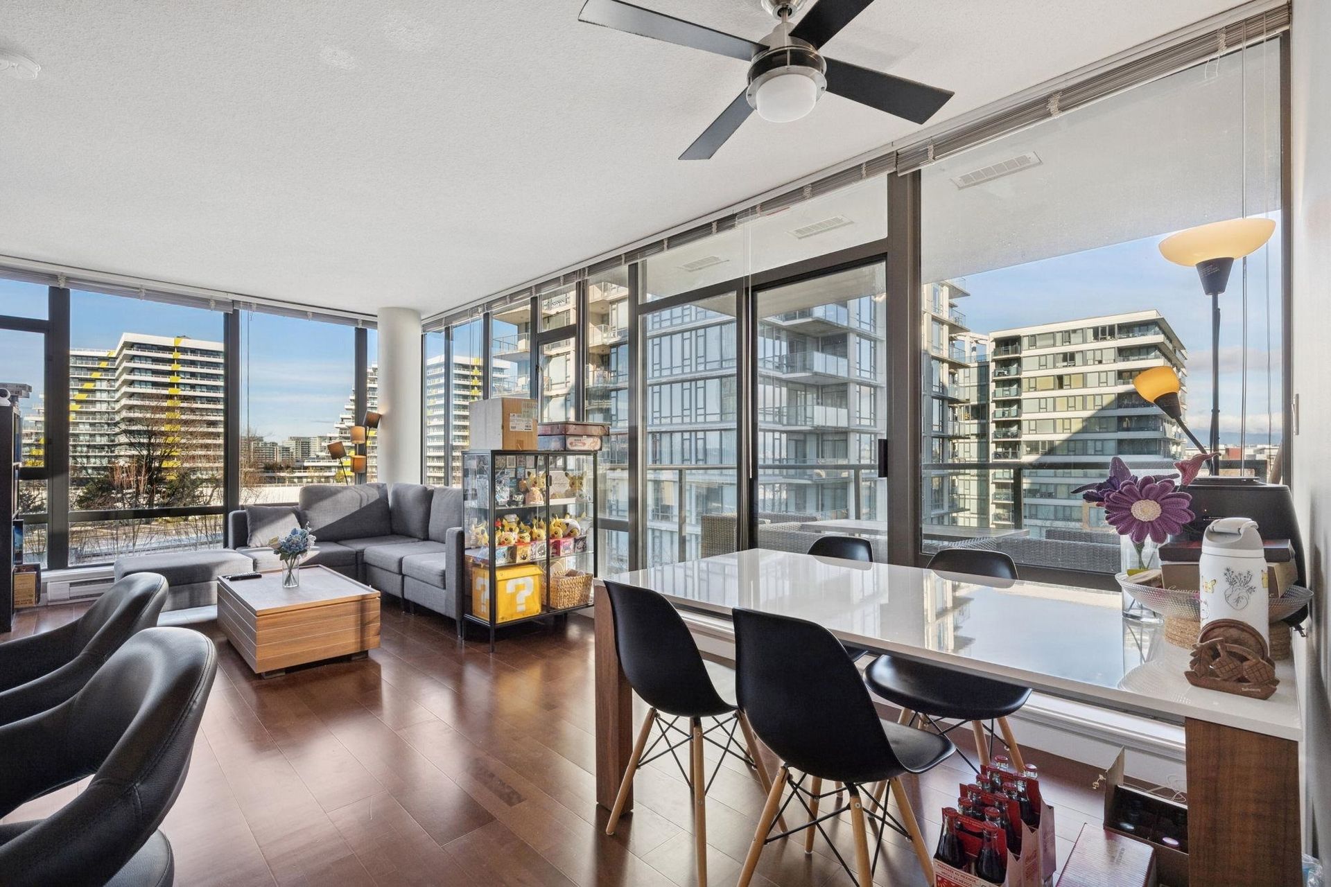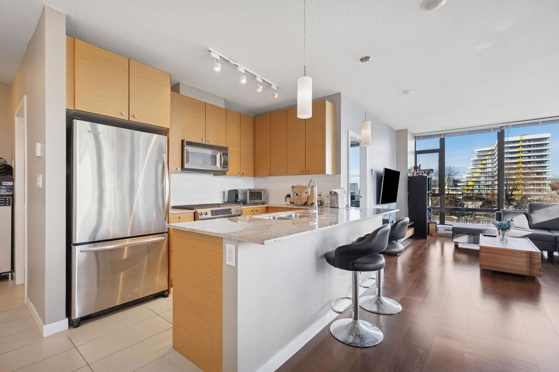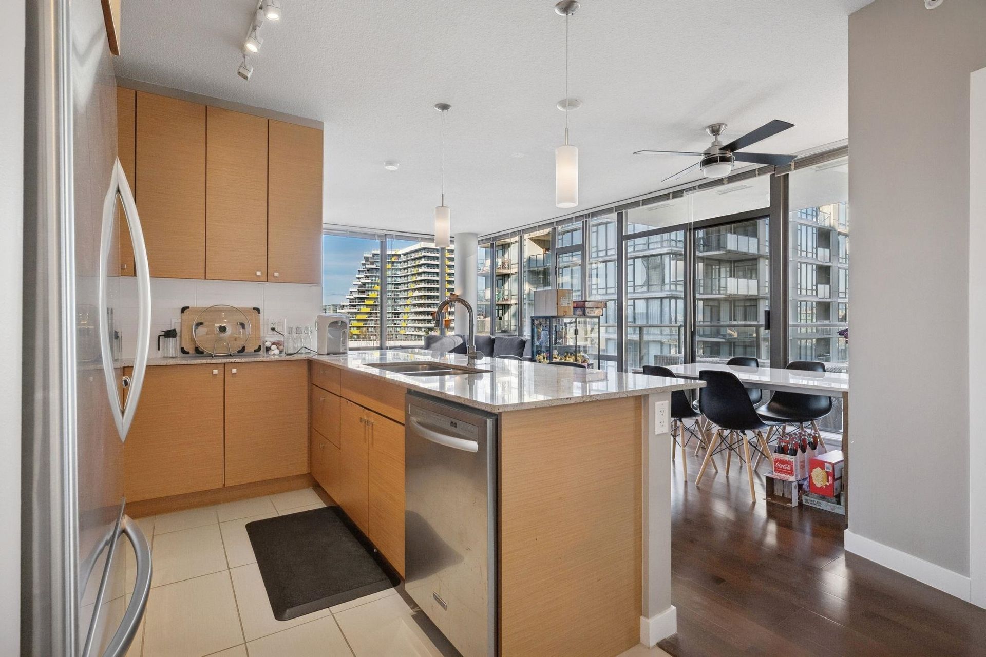 FLO by ONNI. Spacious, corner 2 bedroom home features floor to ceiling windows inviting sunset, city and mountain views! The gourmet kitchen features stone counters, stainless steel appliances, gas cooktop and plenty of storage space, flowing on hardwood flooring into the open concept living and dining areas. The oversized covered balcony extends your living space and provides beautiful al fresco dining. Appreciate private, separated, spacious bedrooms and two bathrooms with ample storage and rich marble countertops. Amenities incude fitness centre, swimming pool, hot tub/sauna and lounge/gardens. Walking distance to the Oval, Dyke trails, SkyTrain, T&T, shopping, eateries and much more. Includes tandem parking for 2 vehicles.