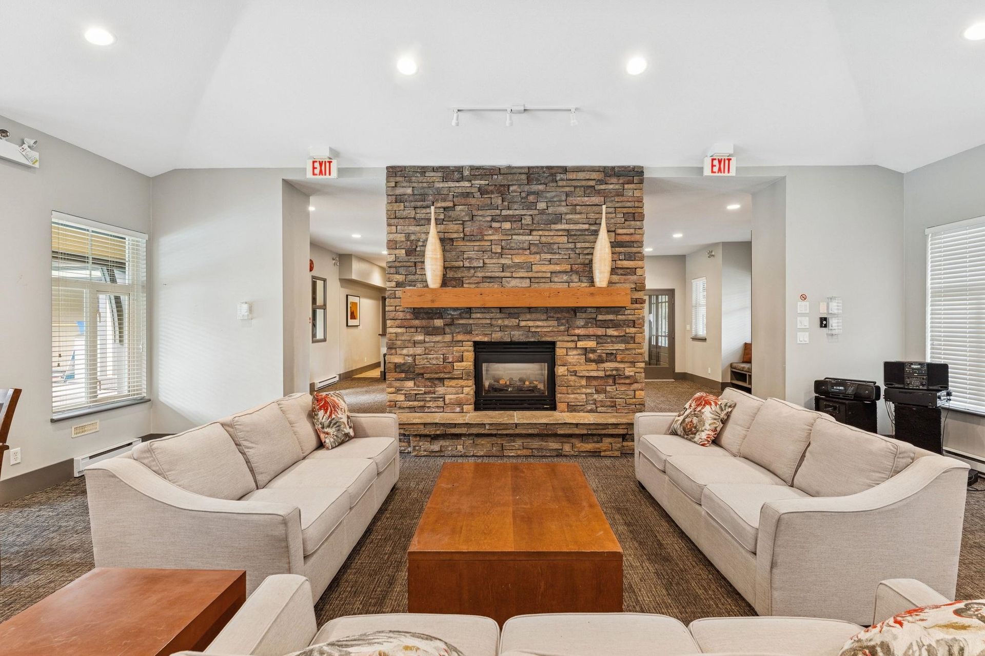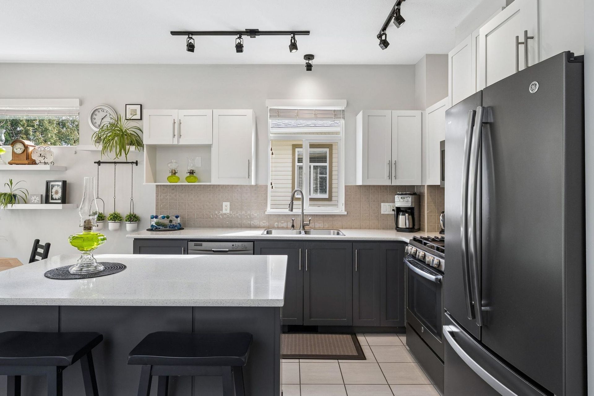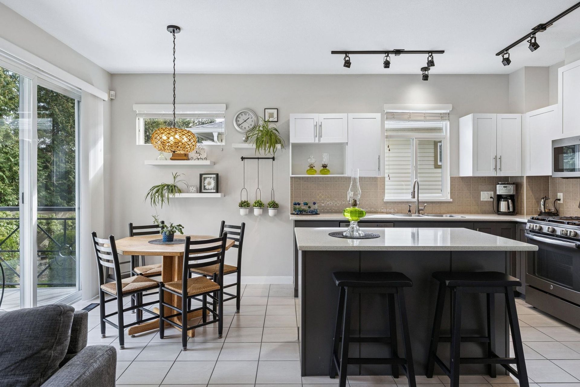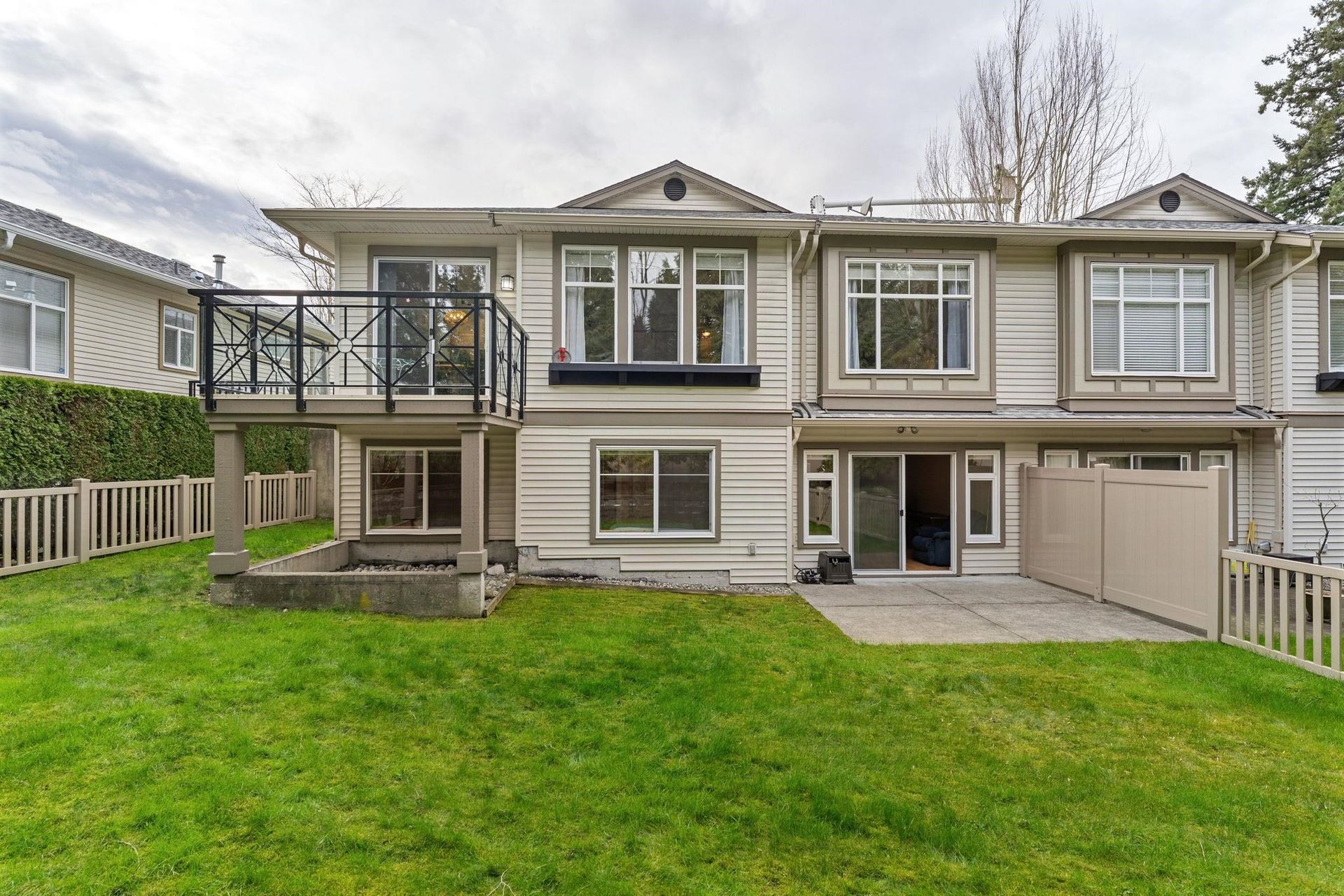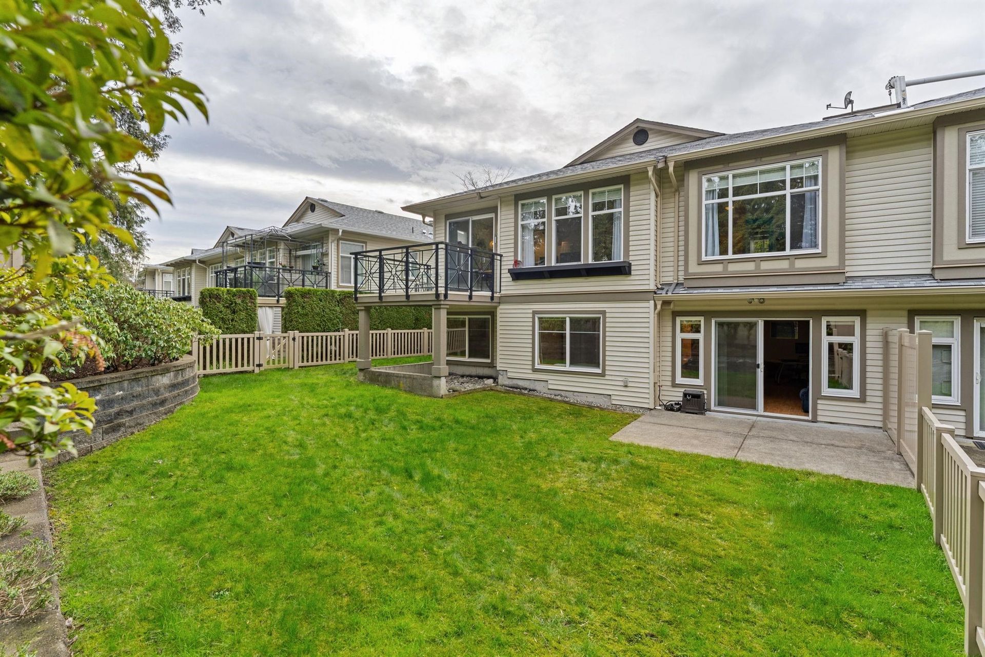 DUPLEX STYLE 2 LEVEL REVERSE PLAN TOWNHOME. This super rare townhome offers bright spacious main floor living spaces including primary bedroom! This beautifully updated and meticulously maintained residences lives like a detached home without the maintenance responsibilities. Appreciate a sleek kitchen with ample storage, stainless steel appliances and island, as well as overheight, vaulted ceilings, hardwood flooring, cozy gas fireplace, oversized windows and large walk out patio! The primary suite is spacious and features a walk in closet and 5 piece ensuite. Below are 2 bedrooms and recreational room that leads out to the private, manicured yard! Apprceciate a double side-by-side garage and a workshop space! Proactive strata with recent updates to balconies, roof, gutters and fences.