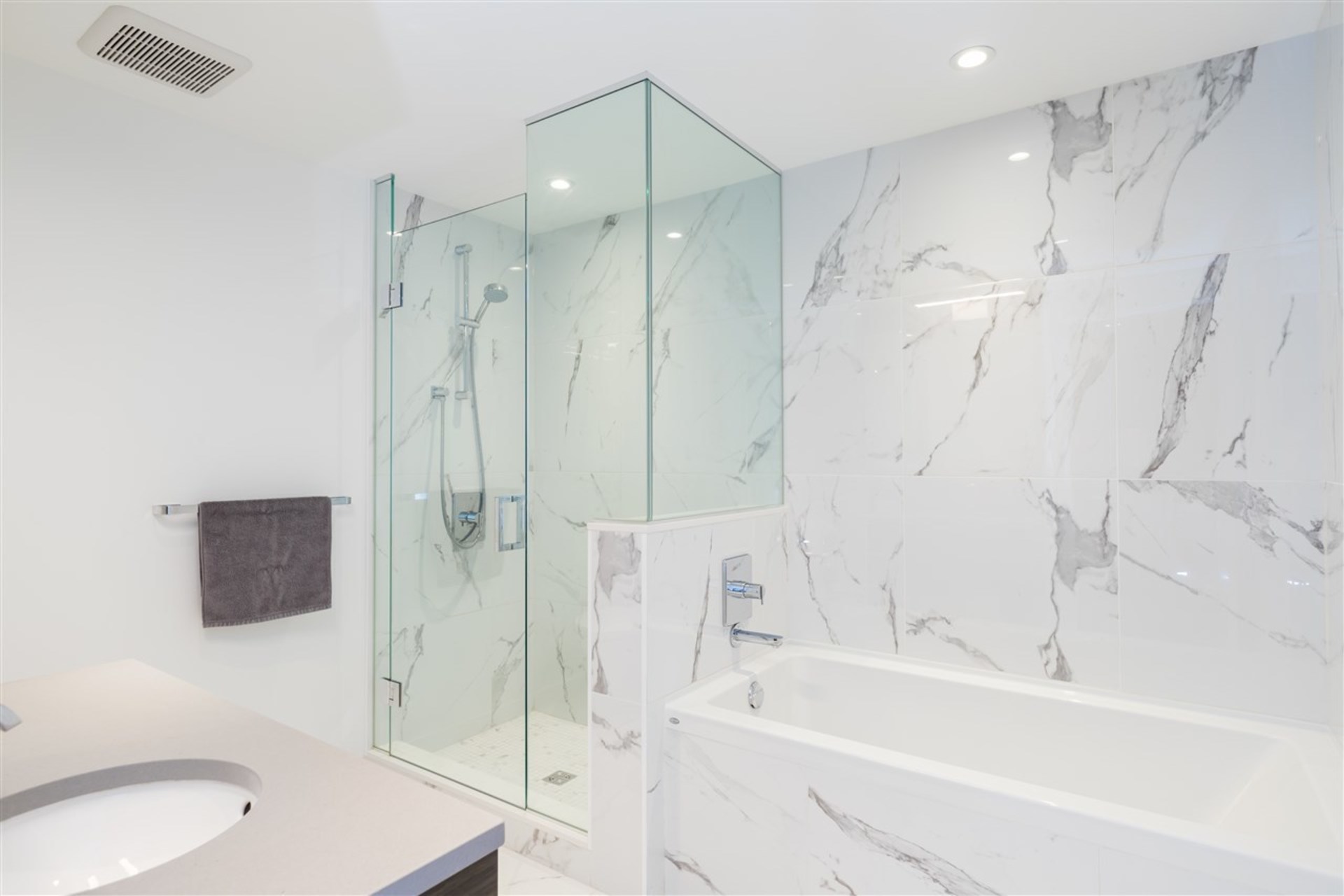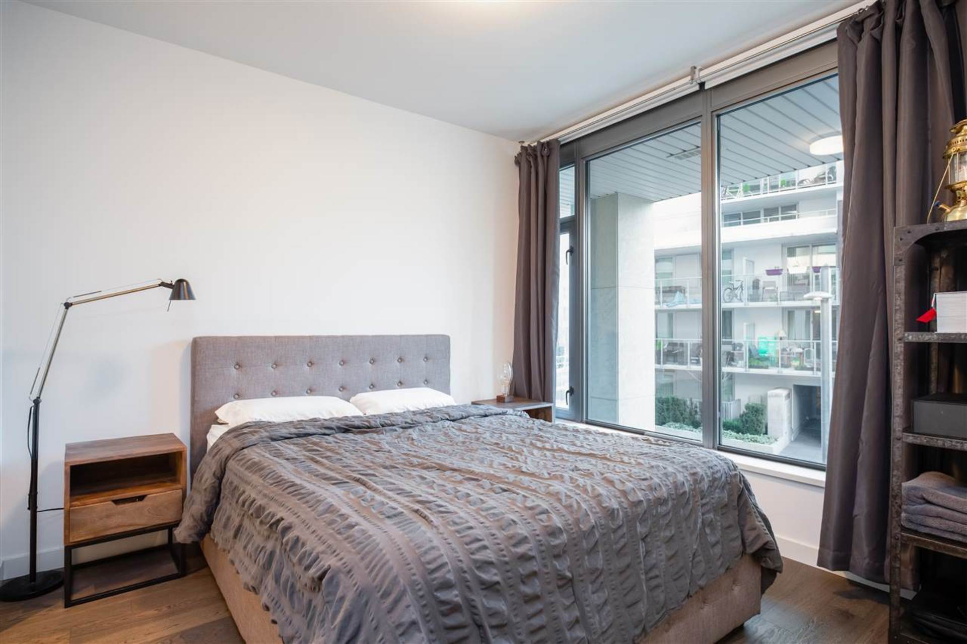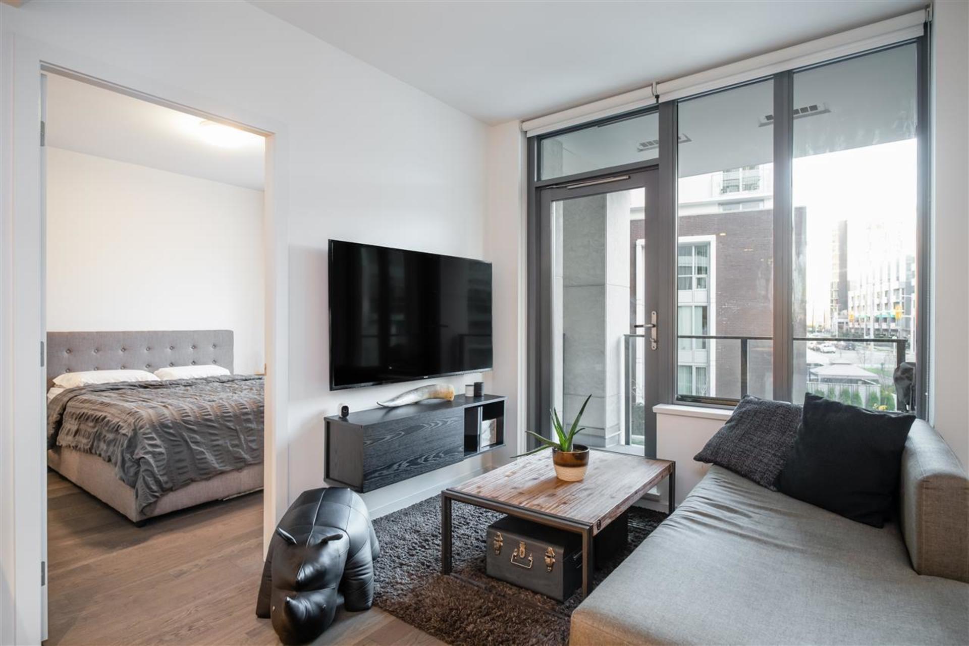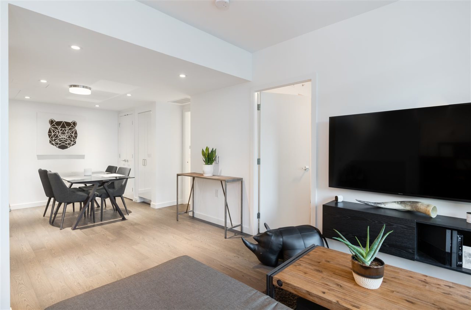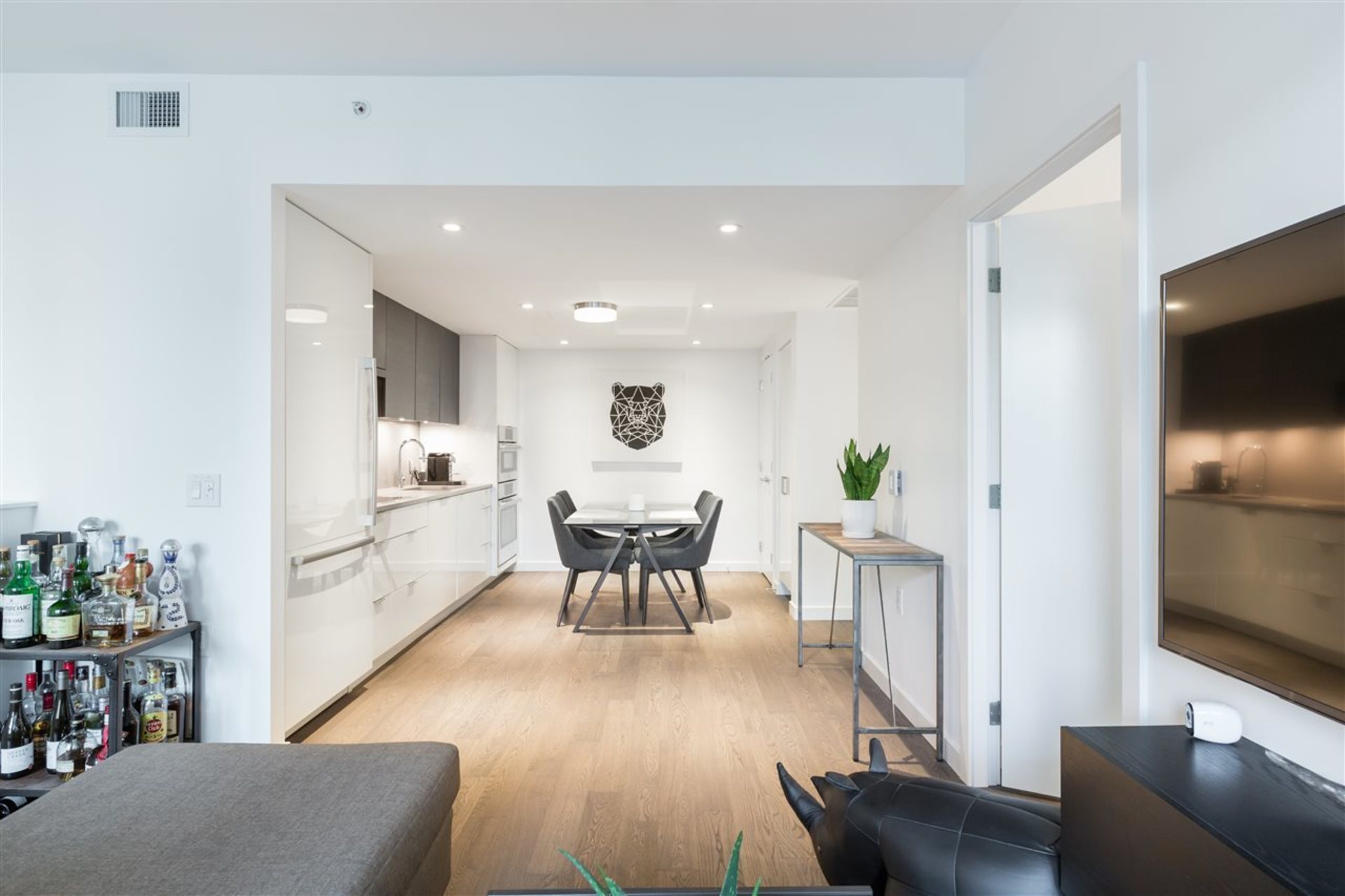 ELEGANT TOWNHOUSE LIVING in the most exciting location. Appreciate a true sense of arrival when you approach your private ground level entrance which leads into an a stunning, air-conditioned home. The functional floorpan features 2 separated bedrooms and an open living and dining room, flowing on designer flooring. The stylish kitchen features full sized integrated Bosch appliances, Caesarstone counters and custom cabinetry. The bathroom boasts a floating vanity with plenty of storage space, separate tub and shower clad in marble print tile and radiant in-floor heating. All of this in the Olympic Village’s premier building - steps to the new 3 acre park & seawall. Amenities include concierge, fitness centre, lounge with rooftop deck. 1 parking, 1 storage.